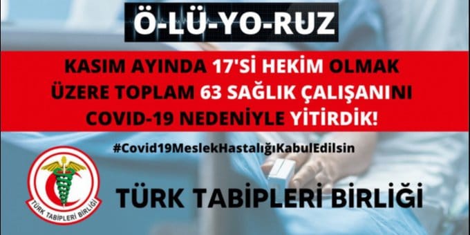 TTB’den yapılan açıklamada, “#Ölüyoruz Kasım ayında 17’si Hekim olmak üzere toplam 63 sağlık çalışanını COVID-19 nedeniyle yitirdik! #TTBHaklı #Yönetemiyorsunuz #Covid19MeslekHastalığıKabulEdilsin” denildi.