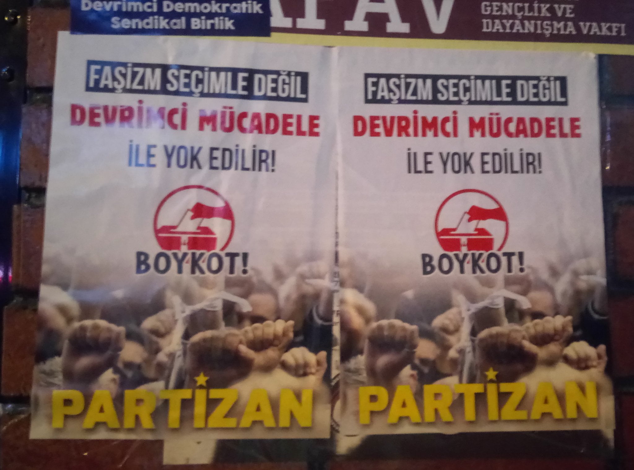 HABER MERKEZİ- Partizan okurları 1 Mayıs Mahallesi’nde kuşlama ve sticker çalışması ile bildiri dağıtımı gerçekleştirerek, seçimleri boykot etme çağrısında bulundu.