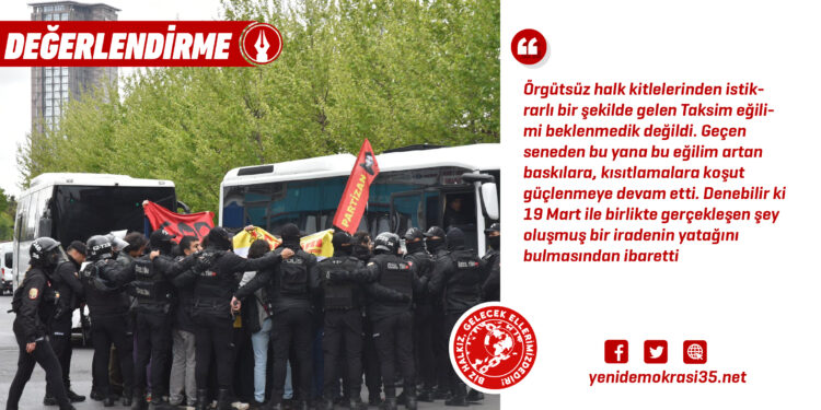 2025 1 Mayıs Taksim deneyimi göstermiştir ki halkın Taksim eğiliminin olmadığını iddia edenler yanılmıştır. Şişli, Feriköy, Mecidiyeköy Merkez ve Levent çevresi, Taksim’e ulaşmak için sokaklara çıkan insanlarla doluydu. Taksim’in fiilî OHAL ve 52 bin polisle kuşatıldığı bir günde, halk 09.00’dan 15.00’e kadar Taksim için yürümeye, “1 Mayıs Alanı Taksim Meydanı’dır” şiarını savunmaya, Taksim’in yolunu açmaya devam etti. Adalet, haklar ve özgürlük talebi kitlelerin yönelimini belirleme devam edecektir. Çünkü cumhurbaşkanlığı hükümet sistemiyle kotarılmaya çalışılan belirsizlikler, çalkantılar önümüzdeki dönemde de yaşanacak. Dolayısıyla egemenlerin demokrasiye ve özgürlüğe kapı açmaları için pek bir neden bulunmuyor. Kitlelere daha çok sirayet edecek 1 Mayıs coşkusu önümüzdeki yıl da kaçınılmazdır. Taksim yasağının “yasa dışılığı” ya da gayri meşruluğu konusunda kitleler daha da aydınlatılmalıdır.1 Mayısların bu yasağı aşmak için özel önem taşıdığı üzerinde de durulmalıdır. Çok çeşitli ve yoğun kalabalıkların bir araya geldiği koşullarda bu yasağı aşmak, bu anlamda yasak kırmak mümkündür ve gelecek sene de bu hedef gündemimizde olacaktır.