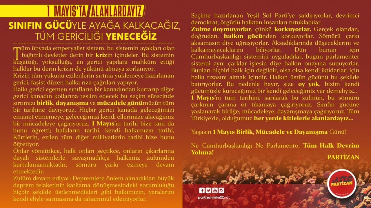 Partizan tarafından yapılan açıklamada “1 Mayıs’ta Alanlardayız! Sınıfın Gücüyle Ayağa Kalkacağız, Tüm Gericiliği Yeneceğiz!” diyerek 1 Mayıs’ta Partizan saflarında buluşma çağrısı yaptı.