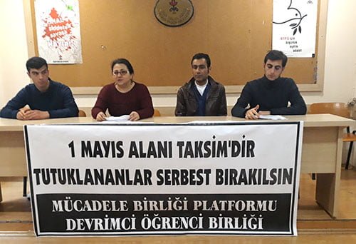 “1 Mayıs Alanı Taksimdir, Tutuklananlar Serbest Bırakılsın Mücadele Birliği Platformu/ Devrimci Öğrenci Birliği” pankartının asıldığı basın açıklamasında, ilk olarak Mücadele Birliği adına konuşma yapılarak, polisin Taksim’deki her tür ablukasına rağmen sabah erken saatlerde pankart açıldığı söylendi.