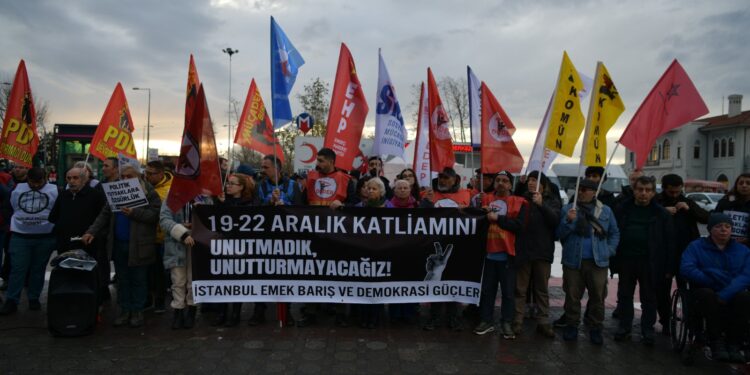 İstanbul Emek, Barış ve Demokrasi Güçleri, 19 Aralık Hapishaneler Katliamının yıl dönümünde Kadıköy Rıhtımda basın açıklaması gerçekleştirdi. “19-22 Aralık Katliamını Unutmadık, Unutturmayacağız” pankartının açıldığı basın açıklamasında “İçerde Dışarda Hücreleri Parçala”, “Yaşasın 19 Aralık Direnişimiz” sloganları atıldı.