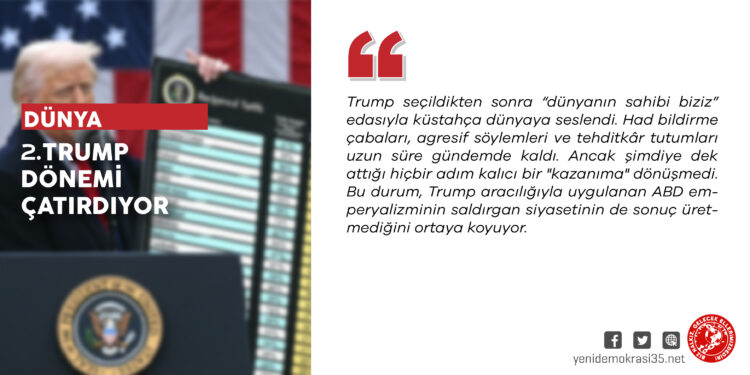Trump seçildikten sonra “dünyanın sahibi biziz” edasıyla küstahça dünyaya seslendi. Had bildirme çabaları, agresif söylemleri ve tehditkâr tutumları uzun süre gündemde kaldı. Ancak şimdiye dek attığı hiçbir adım kalıcı bir “kazanıma” dönüşmedi. Bu durum, Trump aracılığıyla uygulanan ABD emperyalizminin saldırgan siyasetinin de sonuç üretmediğini ortaya koyuyor.