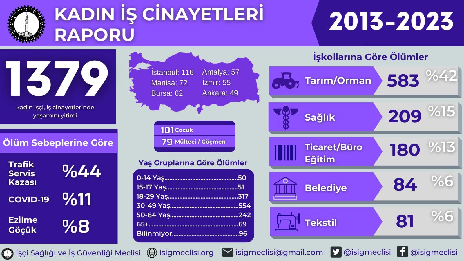 Raporda iş cinayetinde hayatını kaybedenlerin; 50’si, 14 yaş ve altı yaşlarda çocuk işçiler; 51’i 15-17 yaşları arasındaki çocuk/genç işçiler, 317’si kadın iş cinayetlerinin çok yaşandığı yaş aralıklarından biri olan 18-29 yaş arası genç kadın işçiler, 554’ü en çok kadın iş cinayetinin yaşandığı yaş aralığı olan 30-49 yaş arasında kadın işçiler, 242’si 50-64 yaş arası kadın işçiler, 69’u 65 yaş ve üstü kadın işçiler, 96’sı ise yaşını tespit edemediğimiz kadın işçiler.