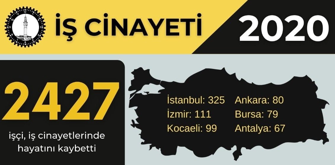 2020 yılında Türkiye’nin 81 şehrinde ve yurtdışında birçok ülkede iş cinayeti gerçekleştiği. İSİG tespit edilen iş cinayetlerini şöyle sıraladı: