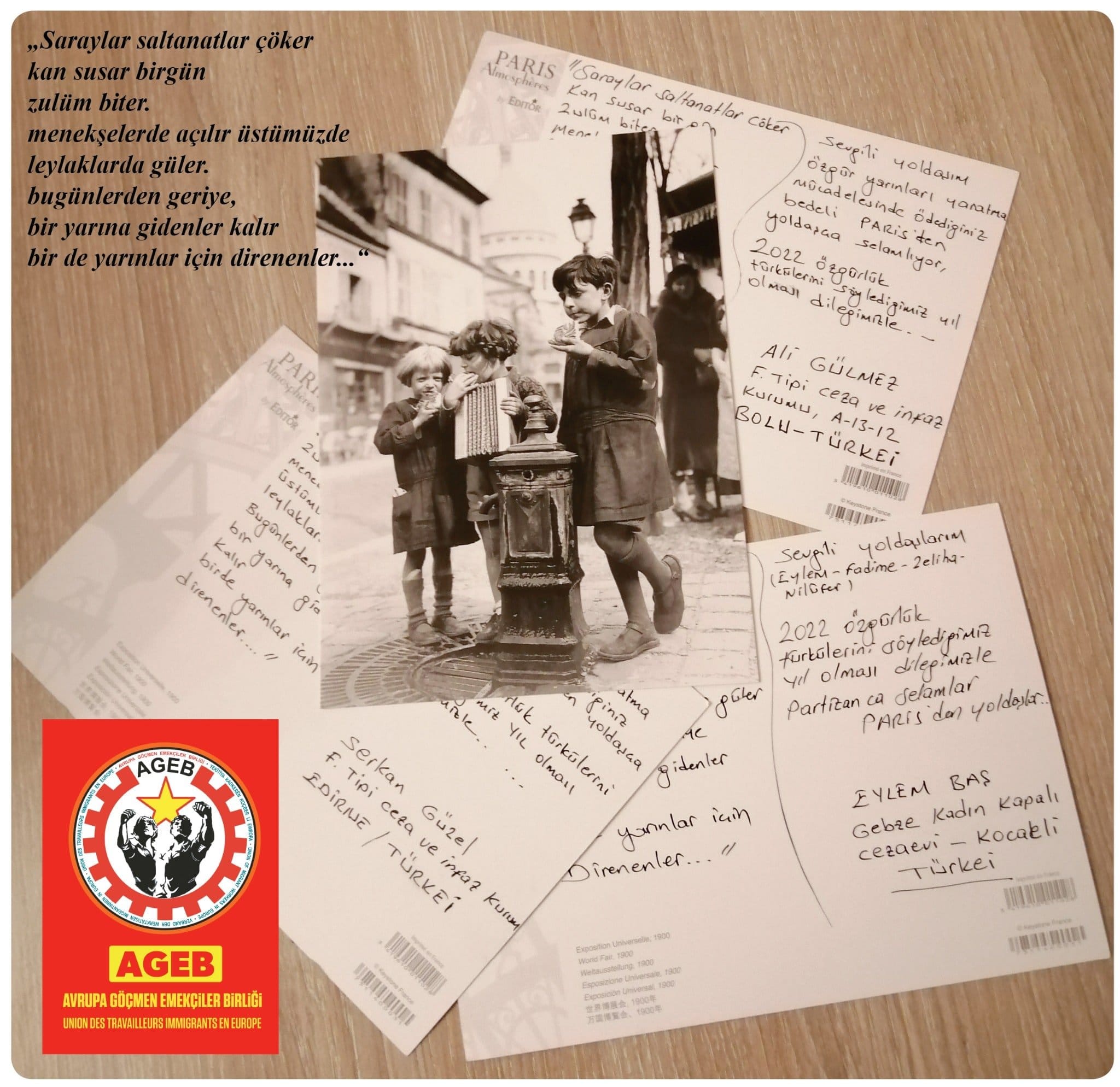 HABER MERKEZİ- Yeni Demokrat Gençlik (YDG) ve Yeni Demokrat Kadın (YDK) üyeleri ile Almanya ve Fransa’dan Avrupa Göçmen Emekçiler Birliği (AGEB) üyeleri tutsak Partizanlar ile devrimci tutsaklara kart yolladı.
