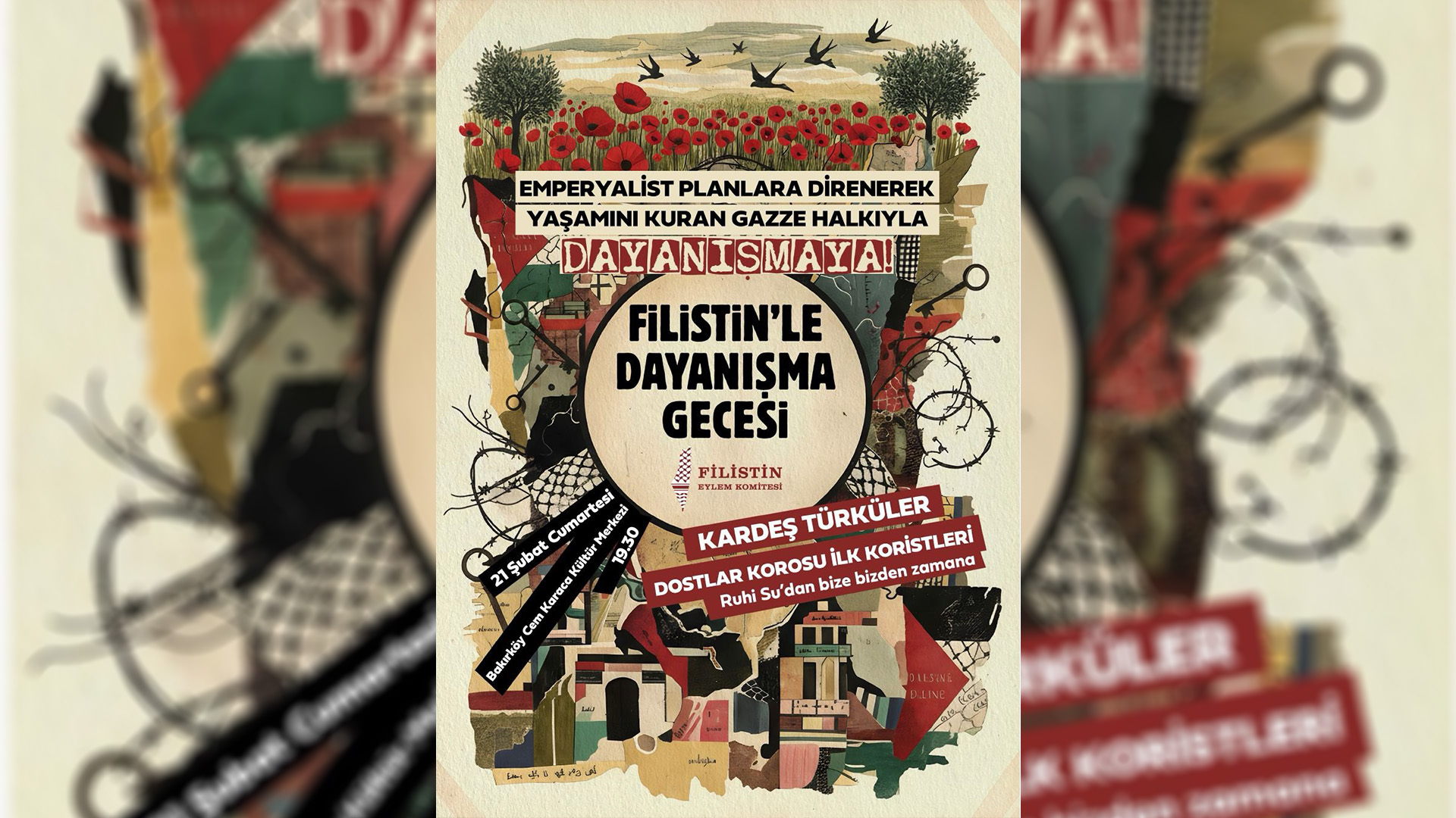 Aralarında Partizan’ın da olduğu devrimci-demokrat kurumlardan oluşan Filistin Eylem Komitesi, Beyt Filastin (Filistin Evi) Derneği’nin desteğiyle “Filistin’le Dayanışma Gecesi” düzenliyor. 21 Şubat Cumartesi günü saat 19.30’da Bakırköy Cem Karaca Kültür Merkezi’nde gerçekleştirilecek etkinlikte Kardeş Türküler ve Dostlar Korosu İlk Koristleri sahne alacak.