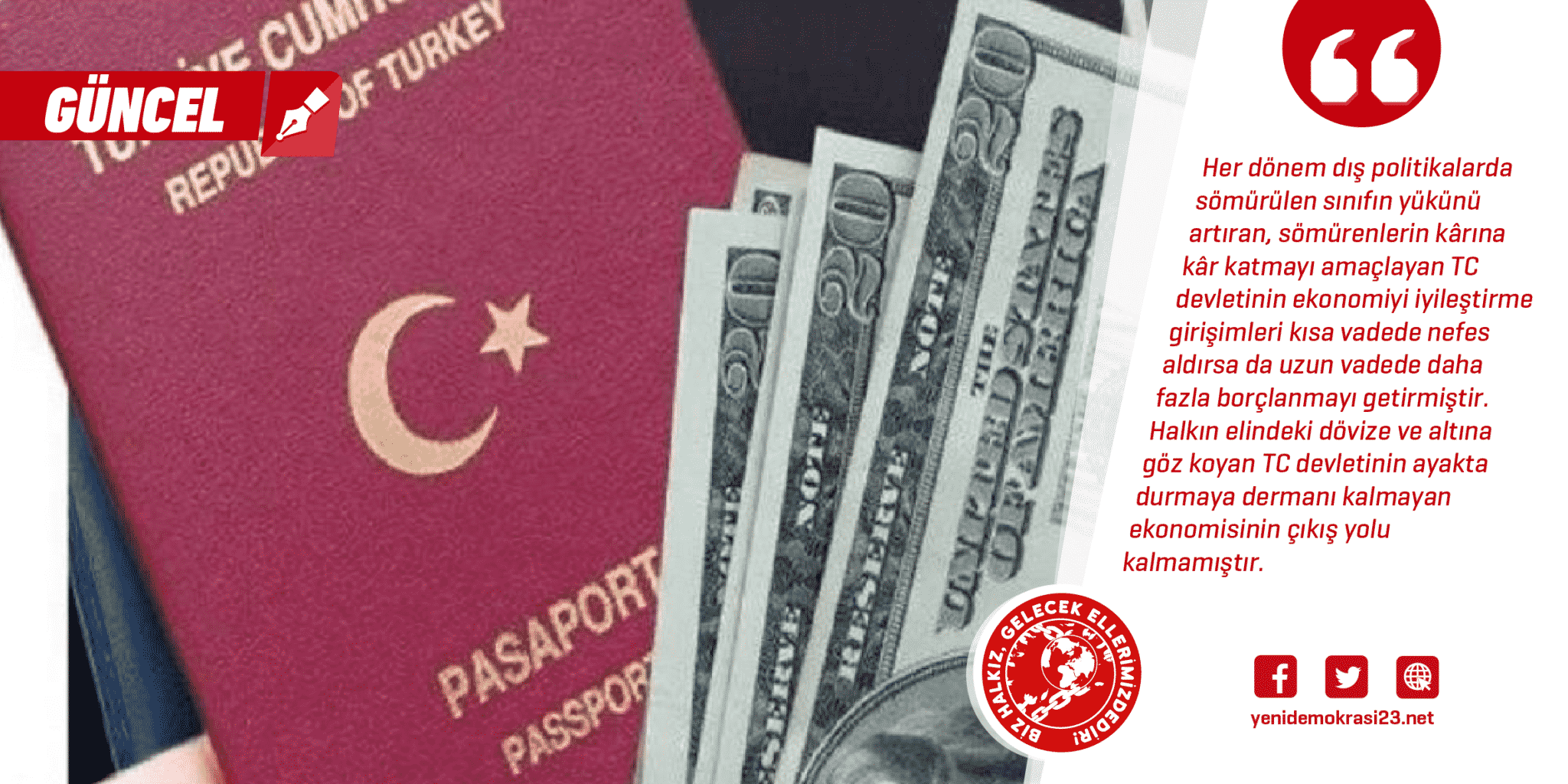Her dönem dış politikalarda sömürülen sınıfın yükünü artıran, sömürenlerin kârına kâr katmayı amaçlayan TC devletinin ekonomiyi iyileştirme girişimleri kısa vadede nefes aldırsa da uzun vadede daha fazla borçlanmayı getirmiştir. Halkın elindeki dövize ve altına göz koyan TC devletinin ayakta durmaya dermanı kalmayan ekonomisinin çıkış yolu kalmamıştır. Derinleşen ekonomik krizin faturasını Türkiye halkına ödetmeye çalışan egemenlerin hesaplarını boşa çıkarmak, her yerde teşhir etmek gerekmektedir.