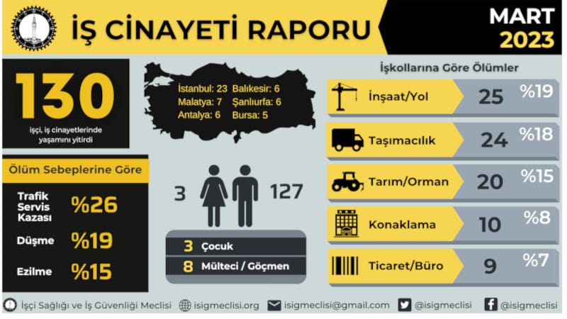 İSİG Meclisi’nden yapılan yazılı açıklamada, mart ayında 130 işçinin iş cinayetlerinde yaşamını yitirdiği belirtilerek bu ayda hayatını kaybedenlerin 3’ünün çocuk, 8’inin mülteci ve 3’ünün kadın olduğu aktarıldı.