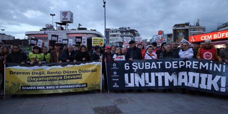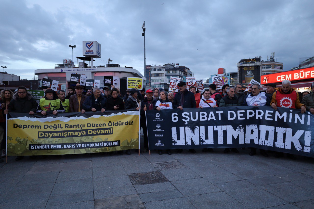 İstanbul Emek Barış ve Demokrasi güçleri 6 Şubat depremlerini anmak için Kadıköy İskele Meydanında “Deprem Değil, Rantçı Düzen Öldürdü! Dayanışmaya Devam”  pankartı açarak bir araya geldi.