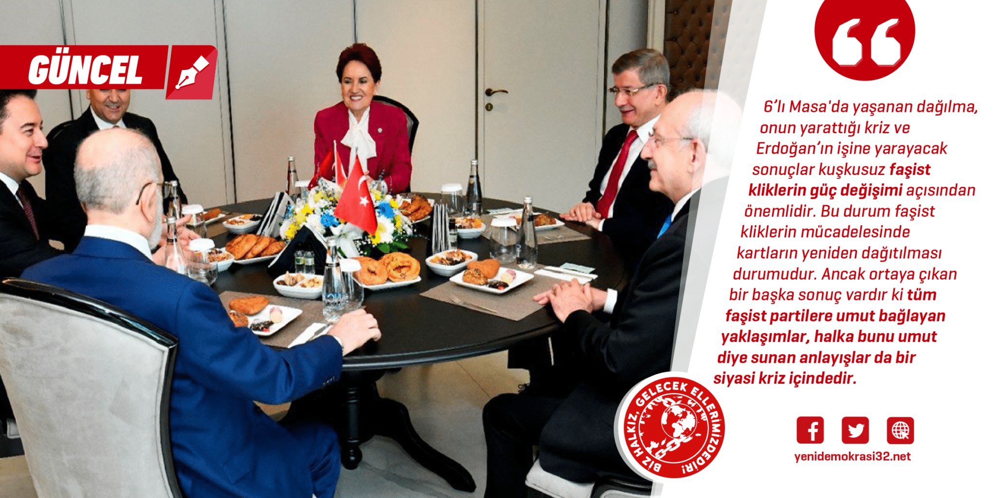 6’lı Masa’ya örgütsüzlükten, zayıflıktan, dağınıklıktan umut bağlayan, değişimin bu ittifakla olanaklı olacağına inanan halkımız seçime “bir kala” yaşanan bu dağılmayla büyük “bir hayal kırıklığı” içine girmiş görünmektedir. Yine AKP-MHP faşist blokunun gitmesine umut bağlayan, seçimlerle yatıp, seçimlerle kalkan, 6’lı Masa’dan umut devşiren reformist güçlerinde “sükûtu hayal” içine düştüğü, düne kadar övgüyle bahsettiği devletin dümenine geçmesinde sorun görmediği İYİP’in gerici-faşist karakterini masayı dağıtan “ihanet”le keşfetmiştir! Şimdi 5’li Masa güzellemesi, İYİP’in zaten faşist olduğunu anlatma zamanıdır onlar için! Yine halkı kandırma, halka gerçeği eksik anlatma görevi üstlenilecektir.