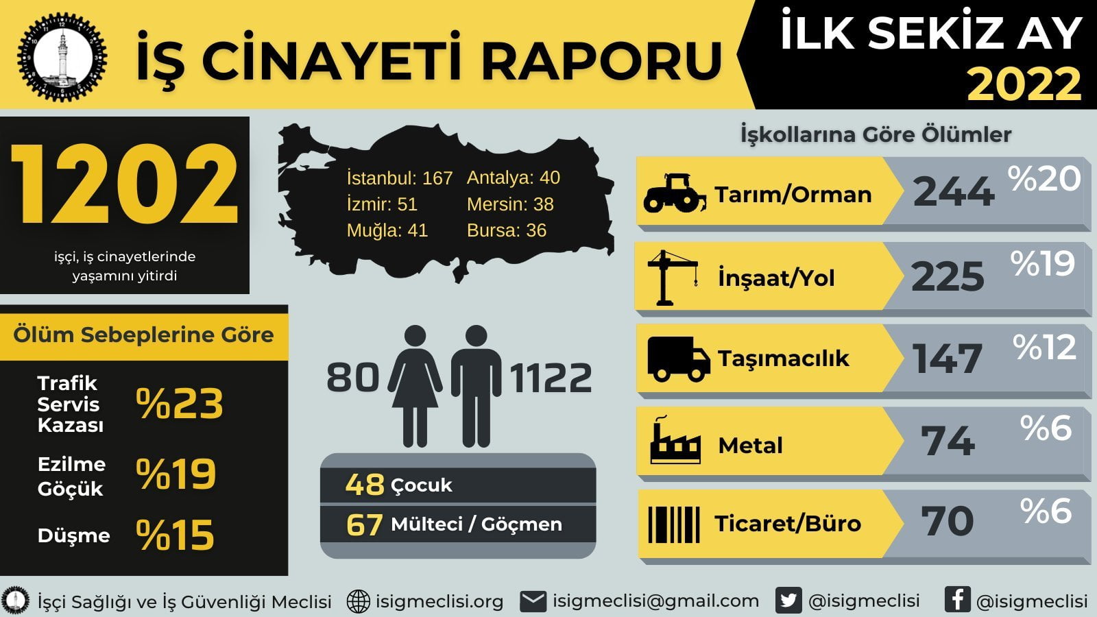 İSİG Meclisi’nin verilerinde iş cinayetlerinin cinsiyetlere göre dağılımında ise 80 kadın işçi ve 1122 erkek işçinin hayatını kaybettiği ortaya konuldu. Cinayetlerinin yaş gruplarına göre dağılımında 48 çocuk işçinin hayatını kaybetti ortaya çıktı.
