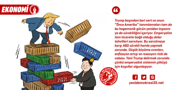 Trump’ın açıklamalarının ardından kurda dalgalanmalar ve borsada kayıplar yaşandı. Gümrük vergilerindeki atışma devam etse de Çin hariç diğer ülkeler için gümrük tarifeleri 90 günlüğüne durduruldu. Bu 90 günde onların sunmak zorunda oldukları tavizlerle birlikte ülkelerle uzlaşma sağlanacak. Birçok kişi Trump’ın 2 Nisan adımından sonra “Trump deli”, “geri adım attı”, “saçma girişimler” gibi yorumlarda bulundu. Bu adımlar delilik midir? Açıklamalara, ifadelere bakılırsa Trump gerçekten de öyle duruyor. Ama emperyalizmin temsilcisini “delilik” etiketiyle anamayız. Bu adım ABD’nin yukarıda da bahsettiğimiz gibi hegemonyasını test eden bir hamledir aynı zamanda. Emperyalist ekonomi sisteminin dayanağı hâlâ dolar. Fakat borç birikiyor, kâr oranları düşüyor. ABD emperyalizmi aleyhine gelişen süreci dolar gücüyle, hegemonyasıyla baskılamak istiyor. “Kazan-kazan” sistemiyle Çin’in daha fazla büyüdüğünü kabullenen ABD, “benim istediğim kadar kazan” diyor. ABD hâlâ dünyada en büyük alıcı ve satıcı konumunda. Bunun kendi lehine kazanç dengesini sağlamak adına da bu hamleleri yapıyor. Hem askerî gücünü hem de ekonomik gücünü baskı olarak kullanıyor. Elbette Çin’e yönelik hamlelerde bu bağın tamamen sökülüp atılmasına olanak verilmek istenmiyor. ABD, Çin’i özellikle kendi pazarı içinde ve bir ölçüde dışarıda da sınırlamak istiyor; ama bu sınırlamanın bir ölçütü olmak zorunda. Çin olmaksızın bir dünya ekonomisi tahayyül edilemez! ABD’nin hâlâ büyük kârlar sağlayan üretimleri Çin’de. Bunların çoğu teknoloji sahasında üretim yapan fabrikalar. Apple, NVIDIA buna iki örnektir. Yarı iletken çip üretimi ve parça üretimi Çin’de yoğunlaşıyor. ABD’nin ilk hamlesinin ardından gümrük vergileri yüzde 245’e çıksa da teknoloji hammaddeleri bu vergilerden muaf tutuldu. Çin basınında ve devletin açıklamalarında “ABD de kaybedecek” açıklamaları yapıldı. 2 Nisan’dan sonra Çin, iç piyasaya yöneleceğini ve farklı ticarî ilişkilere yöneleceğini açıklayarak “ABD’ye mecbur değiliz” dedi. Bu yönde kapsamlı ve yoğun kampanyalar da içeren çalışmalar gerçekleştirilmekte. Buna karşın gümrük vergilerinin ardından Çinli şirketlerin iç piyasada yatırımcıları gezerek üretimi ve dağıtımı denetlemeleri ve güvenceleri yineleme çabaları dikkate değer bir bilgi olarak ihmal edilmemeli. Gene de bu ticarî saldırının sonuçları oldu. Bazı şirketlerin 2 Nisan’dan sonra üretime ara verdiği belirtiliyor. Emperyalist ekonominin temel sorunu olan “güvenilir yatırım” şu an için rafa kalktı. Zaten son yıllarda “belirsizlik” hâkim. Artan yoksulluk bunun en büyük örneği. Trump’ın hamleleri “delice” gözükebilir. Fakat zaten emperyalizmin doğasında delilik, olağan dışılık vardır. Emperyalist merkezlerde de ABD dahil enflasyon artış riski var. Bu da hayat pahalılığına yansıyor. İçteki siyasî krizi körükleyen yoksullaşma, “delice” hamlelere ve popülizme dönüşüyor. Trump başından beri sert ve onun “Önce Amerika” tanımlamaları tam da bu hegemonik gücün yeniden inşasını ya da sürekliliğini içeriyor. Emperyalist tüm ticaretin bağlı olduğu dolar tahvilleri sarsılıyor. Bu sarsılmaya karşı ABD sürekli hamle yapmak zorunda. Düşük büyüme oranları, enflasyon artışı ve resesyon riski de cabası. Yani Trump delirmek zorunda çünkü emperyalist sistemin çöküşü için koşullar olgunlaşıyor.