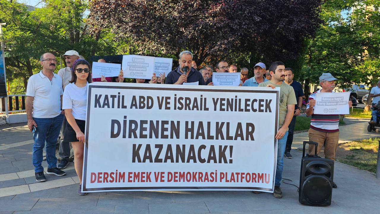 Dersim Emek ve Demokrasi Platformu tarafından Seyit Rıza Meydanında düzenlenen açıklamayı Ergin Tekin okudu. “ABD emperyalizmi destekli İsrail yönetimi, geçtiğimiz hafta İran’ı hedef aldı. İsrail’in Gazze’de soykırıma imza atan Başbakanı Netanyahu, İran’ın nükleer tesislerine yönelik saldırının “günler süreceğini” ifade etti. Afganistan ve Irak işgalleriyle başlayan, Libya ve Suriye üzerinden ilerleyen emperyalist yıkım zincirinin son halkası İran oldu. İşgalci İsrail devletinin İran’a dönük ve saldırılarıyla başlayan fiili savaş ortamı bölge halkları için ölüm, geleceğimiz için tehdit oluşturuyor. İsrail’in fitili yakmasıyla, Filistin ve İran’da çok sayıda masum sivil hayatını kaybetti, milyonlarca kişi yaşadıkları yerleri terk etti. Pervasız saldırganlık ve soykırıma varan katliamlar nedeniyle nükleer savaş veya sızıntı riski artıyor.” denilen açıklamada bu saldırıların ABD ve İsrail’in ortak tutumu olduğu ifade edildi.