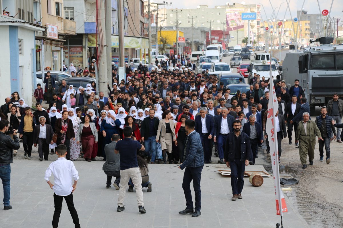Şavluk ve Fidan, aralarında HDP Şırnak milletvekilleri Hüseyin Kaçmaz ve Nuran İmir’in de bulunduğu yüzlerce kişiyle birlikte parti binasından belediye binasına kadar yürüdü. Polis ablukası altında belediye binası bahçesinden giren eşbaşkanlar, alkış ve zılgıtlarla karşılandı.