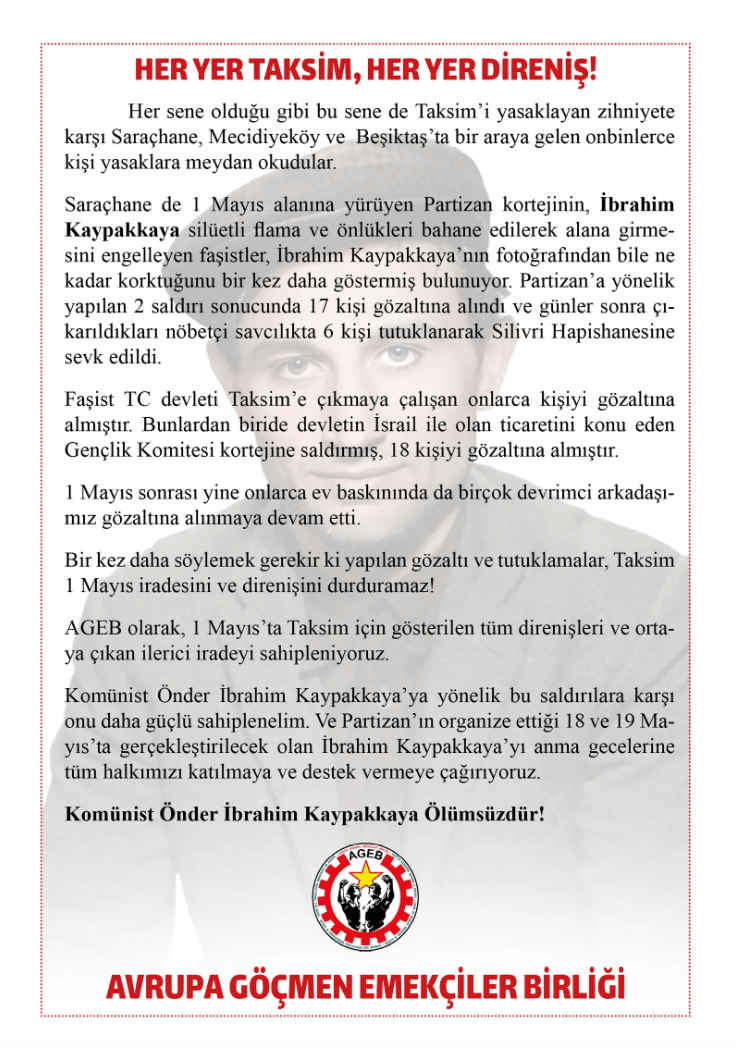 Avrupa Göçmen Emekçiler Birliği (AGEB) 1 Mayıs’ta ve sonrasında yaşanan gözaltı ve tutuklamalara dair açıklama yaparak “Bir kez daha söylemek gerekir ki yapılan gözaltı ve tutuklamalar, Taksim 1 Mayıs iradesini ve direnişini durduramaz!” dedi.