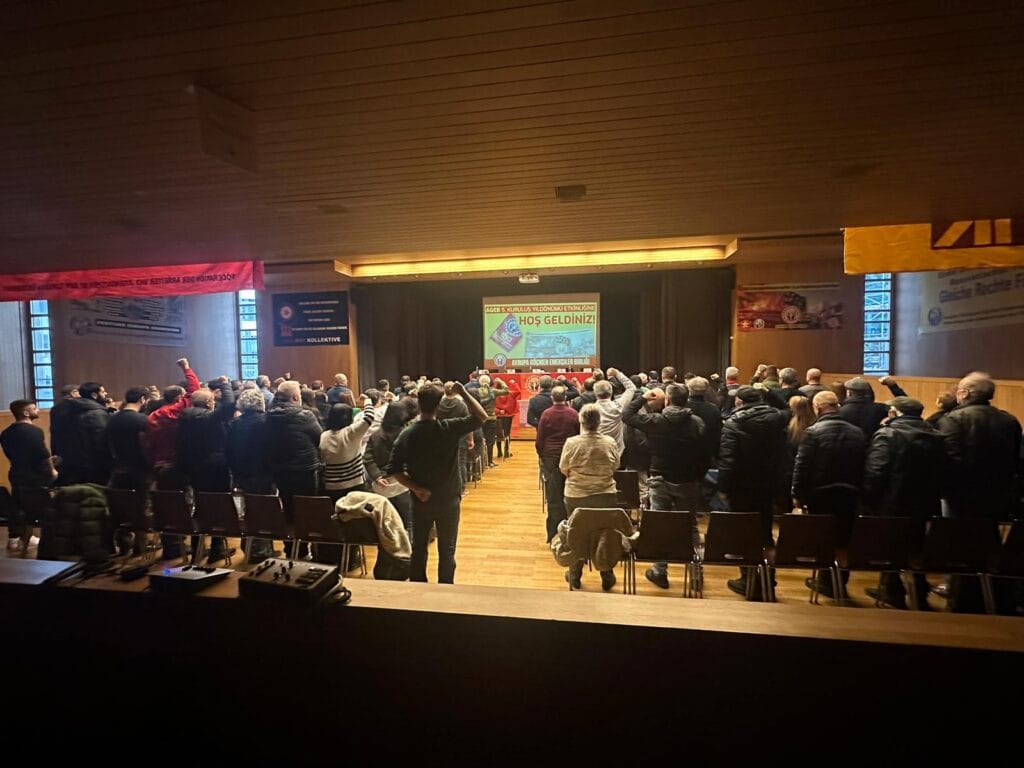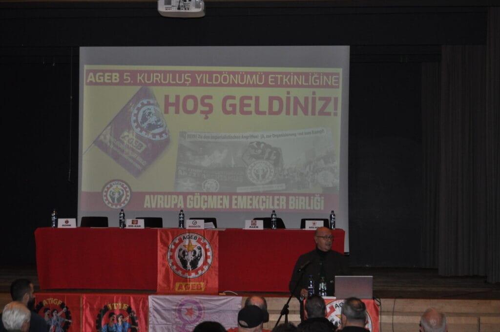 Ardından AGEB’in 5 yıllık mücadele tarihindeki çeşitli faaliyet kesitlerinin yer aldığı sinevizyon gösterimi yapıldı. Sinevizyon sonrası araştırmacı-yazar Murat Çakır Avrupa’da politik sürece dair değerlendirme ve analizlerini içeren bir sunum gerçekleştirdi. Murat Çakır konuşmasında emperyalistlerin kendi arasında yaşadığı ciddi hegemonya mücadelesi ve çatışmalara değindi. “3. Dünya Savaşı” tartışmasının yürüdüğünü ve eğer böyle bir savaş çıkarsa bunun nükleer bir savaş olacağını vurguladı. BRICS ve benzeri yeni oluşumların ABD’nin etkinlik alanını daralttığını, bu kutuplaşma ve çelişkilerin daha da derinleşeceğini söyledi. Önümüzdeki süreçte emperyalist kapitalistler tarafından işçi ve emekçilere yönelik ciddi saldırıların olacağını bu nedenle bu saldırılara karşı işçi sınıfı ve emekçilerin birlikte mücadele etmesi gerektiğinin önemli olduğunu vurguladı.