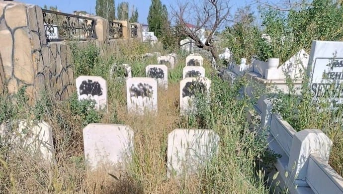 Ağrı’nın Doğubayazıt ilçesindeki Koçkıran Şehir Mezarlığı’nda bulunan HPG’lilere ait mezarlar siyah sprey boyalarla tahrip edildi. Birçok mezar taşının sprey boya ile siyaha boyandığı görüldü.