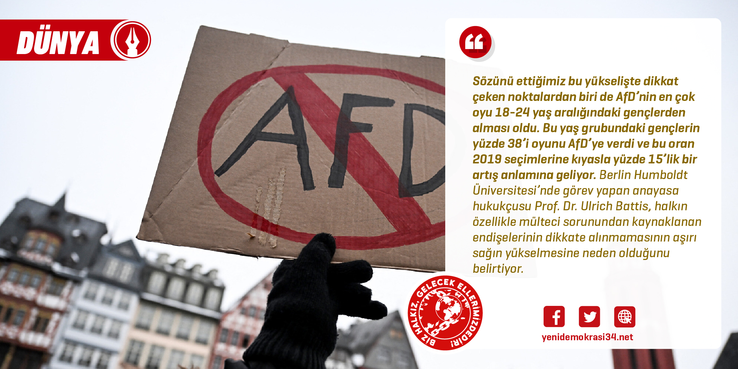 2. Emperyalist Paylaşım Savaşı’nın (EPS) başlıca sorumlusu olan Nazi Almanya’sından sonrası bu ülkede aşırı sağcı, ırkçı partilerin faaliyetleri yasaklanmış ve bunların hiçbir zaman iktidara gelemeyeceği belirlenmişti. Ancak aşırı sağ partiler tüzüklerinde küçük değişiklikler yaparak faaliyetlerini bugüne kadar sürdürdüler. “Dexit” yani Almanya’nın Avrupa Birliği’nden (AB) çıkması, avrodan vazgeçilerek yeniden Alman markına dönülmesi politikasıyla 6 Şubat 2013 tarihinde kurulan Almanya için Alternatif Partisi (AfD), başından beri aşırı milliyetçi ve ırkçı politikalar izlemektedir. AfD, 2014 Avrupa Parlamentosu seçimlerinde Avrupalı Muhafazakârlar ve Reformcular’ın (ECR) üyesi olarak 7 sandalye kazanmıştı. 2017 Almanya federal meclis seçimlerinde ise 94 sandalye kazandı ve ülkedeki 3. büyük parti ve aynı zamanda en büyük muhalefet partisi oldu. 2021 federal seçimlerinde bu kez AfD beşinci büyük parti konumuna geriledi. 2023’ten bu yana yapılan anketler AfD’yi en popüler 2. parti olarak gösterirken yapılan son seçimde yani 1 Eylül’de yapılan seçimlerde rekor düzeyde oy aldı.