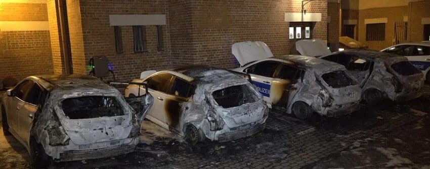 ALMANYA- 24 Ocak gecesi, Leipzig’in Abtnaundorf semtindeki belediye binasının arka bahçesinde dört elektrikli polis arabası ateşe verildi.