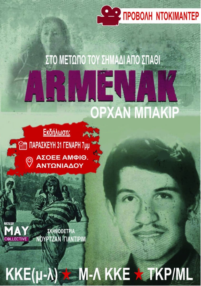 Böylesi bir komünisti gelecek nesillere aktarmayı, onu ve mücadelesini anlatmayı hedefleyen belgeselin “Parti ve Devrim Şehitlerini” anma etkinlikleri kapsamında Atina’daki gösterimine tüm devrimci, demokrat kamuoyu ve halk davet edildi.