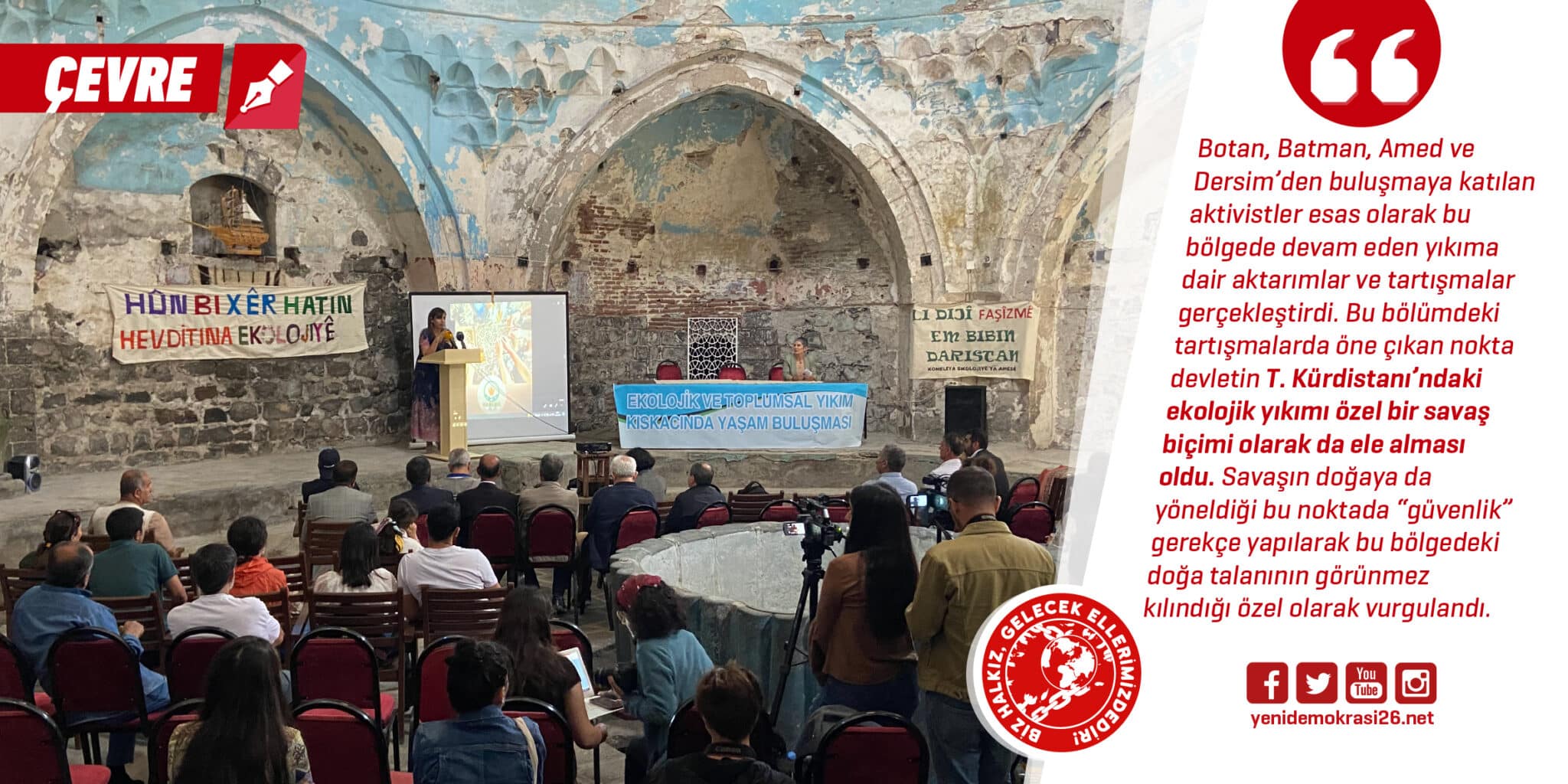Amed’deki buluşmada haksız savaşlardaki askeri operasyonlarının neden olduğu ekolojik yıkıma karşı ortak mücadele vurguları güçlüydü. Farklı coğrafyalarda devlet ve sermaye iş birliği ile yapılan doğa talanına hep birlikte dur demenin bu buluşmadaki ortak ruh ve birlikte hareket etmekle mümkün olduğu belirtilerek daha somut politikalarla çalışmaların sürdürülmesi gerektiği dile getirildi. Somut, gerçekliği kavrayan politikalar olmaksızın salt yerel direnişlerde elde edilen kazanımların yeterli olmadığı noktasında fikir birliği oluştu. Yine T. Kürdistanı’nda çevreye ve yaşam alanlarına yönelik askeri operasyonlar ve güvenlikçi politikalar eşliğinde çok ağır bir saldırının gerçekleştiği buna karşı tepkilerin ve mücadelenin yeterli olmayışının söz konusu projeleri ve politikayı güçlendirdiği noktasında ortak görüşler dile getirildi. Ekolojik talanın ve buna neden olan sisteme karşı mücadelenin ancak toplumsal mücadele zemininde buluşulduğunda somut bir güce dönüşeceği ve mücadelenin kazanılabileceği vurgusuyla buluşma sona erdi.