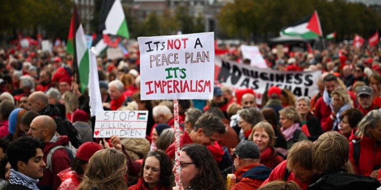 Hollanda’nın başkenti Amsterdam’da toplanan yaklaşık 250 bin kişi, hükümetin İsrail yanlısı politikasına tepki gösterdi.