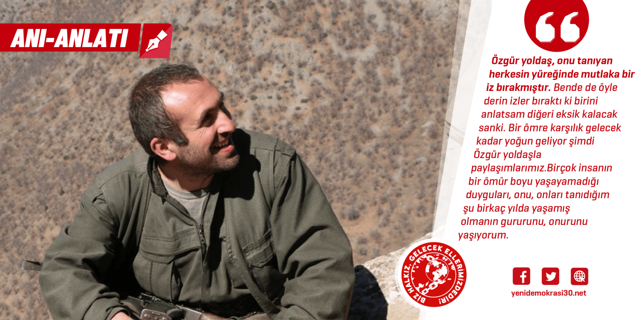 Özgür yoldaş, onu tanıyan herkesin yüreğinde mutlaka bir iz bırakmıştır. Bende de öyle derin izler bıraktı ki birini anlatsam diğeri eksik kalacak sanki. Bir ömre karşılık gelecek kadar yoğun geliyor şimdi Özgür yoldaşla paylaşımlarımız. Birçok insanın bir ömür boyu yaşayamadığı duyguları, onu, onları tanıdığım şu birkaç yılda yaşamış olmanın gururunu, onurunu yaşıyorum.