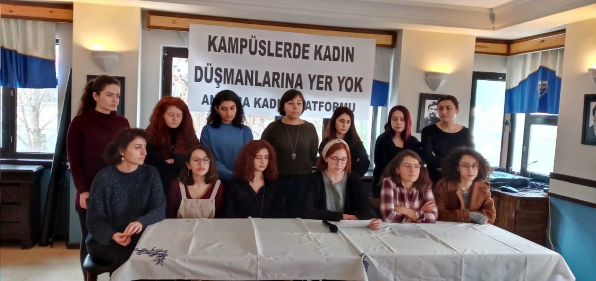 Ankara Kadın Platformu, geçen hafta Türkiye Gençlik Birliği’nin (TGB) hedef göstermesinin ardından Ankara Üniversitesi Cebeci Kampüsü’nde Las Tesis dansı yaptıkları için gözaltına alınan kadınlar ile dayanışmak amacıyla Mülkiyeliler Birliği’nde basın toplantısı düzenledi. Toplantıda, platform adına açıklamayı Ankara Üniversitesi öğrencisi Nazlı İkray Öztay okudu.