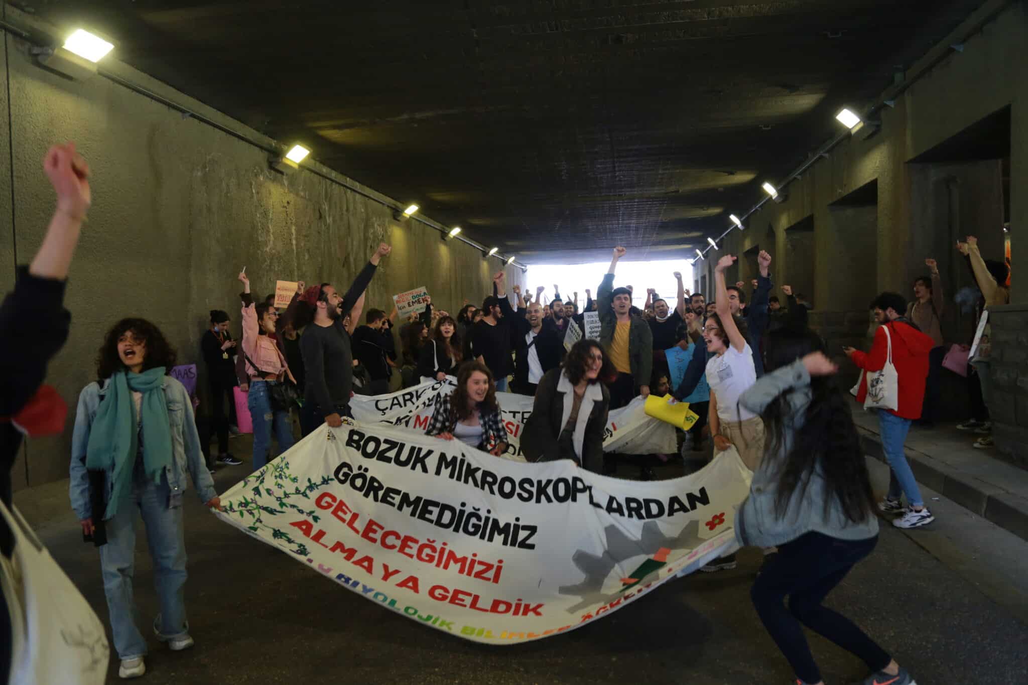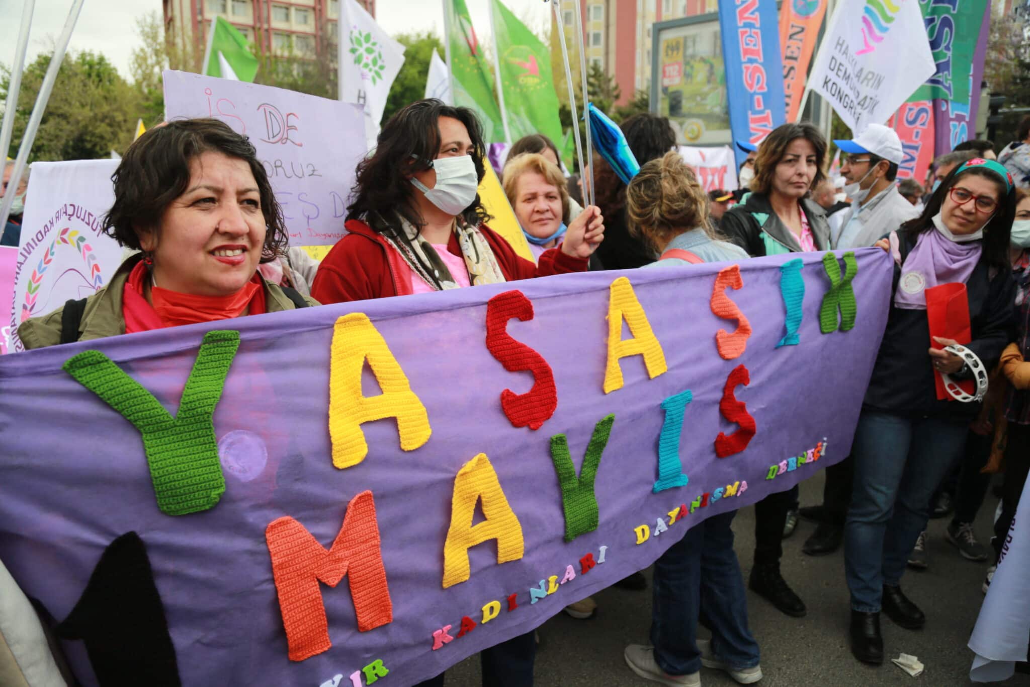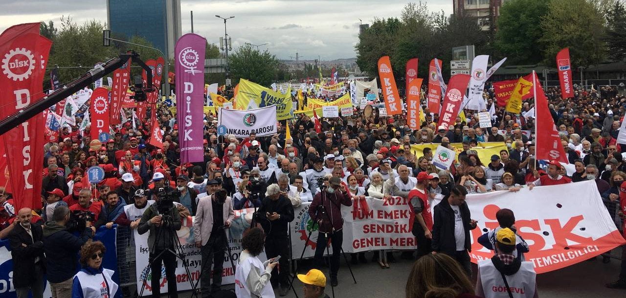 “Bu daha başlangıç mücadeleye devam”, “Yaşasın 1 Mayıs” sloganlarının yükseldiği yürüyüşte; “İstanbul Sözleşmesi’nden vazgeçmiyoruz”, “Biz de kamu emekçisiyiz kadro verilsin”, “Eşitlik özgürlük, dayanışma, barış”, “Herkese güvenceli iş güvenceli gelecek”, “Zamlara karşı birlikte mücadeleye”, “Çırak değil çocuk” dövizleri ve çok sayıda sendikanın bayrakları taşındı.