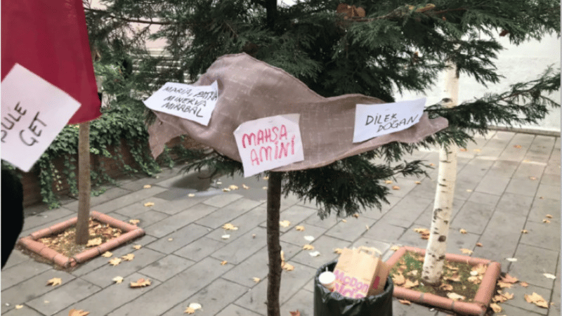 Ankara Üniversitesi Cebeci yerleşkesinde bulunan Siyasal Bilgiler Fakültesi bahçesinde düzenlenen 25 Kasım Kadına Yönelik Şiddete Karşı Uluslararası Mücadele Günü etkinliğinde katledilen kadınları anan öğrencilere faşist bir güruh saldırdı. Faşistler, üzerinde Jîna Emînî’nin adının da yazılı olduğu pankartları yırttı.