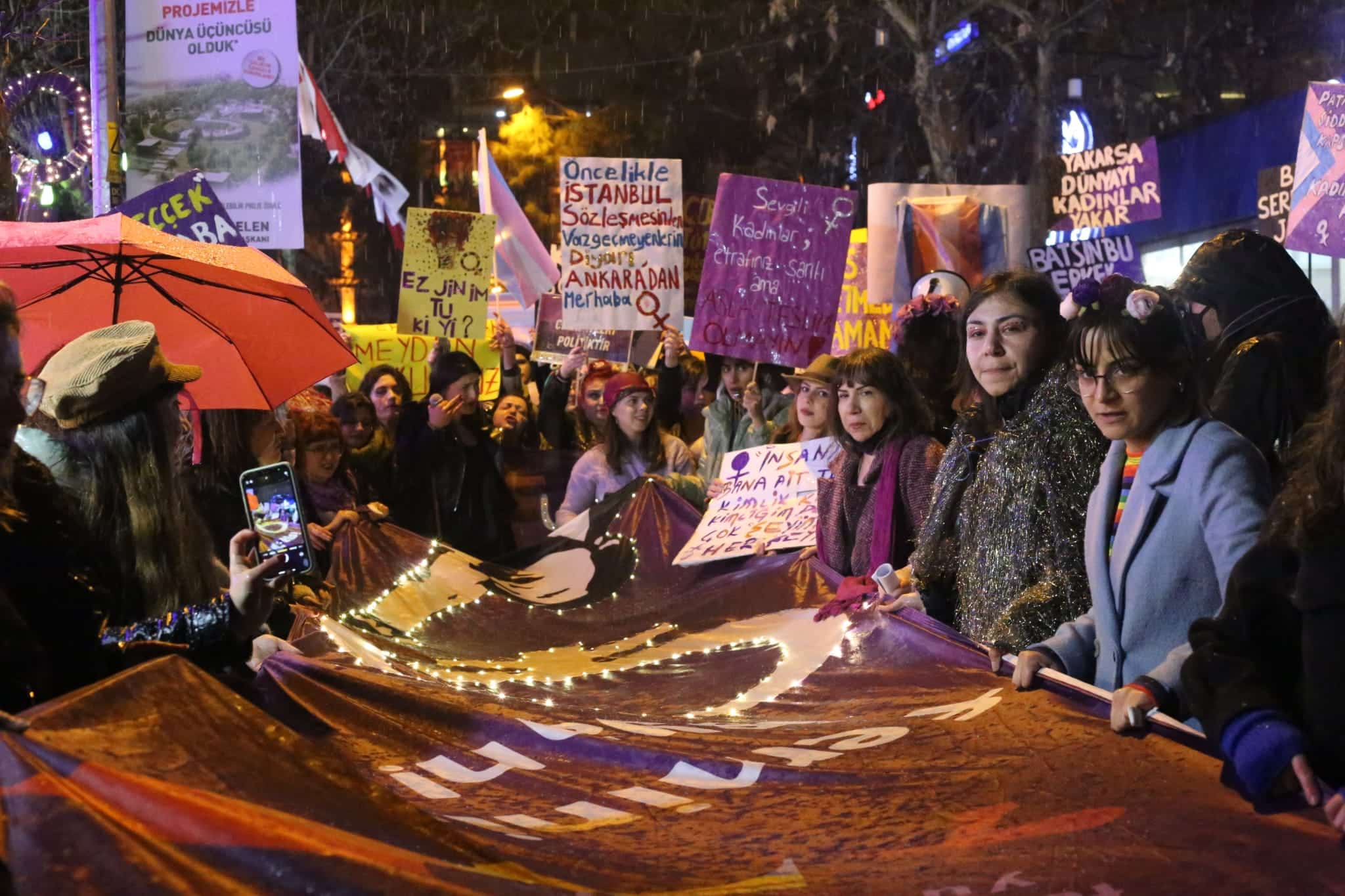 Ankara’da kadınlar, bu yıl 16’ncısı düzenlenen Feminist Gece Yürüyüşü’nü gerçekleştirdi. Sakarya Meydanı’nda sloganlarla ve dövizlerle yürüdü. Eylemde, ‘‘kadın cinayetlerinin engellenmesi için önleyici politikaların devreye girmesini’’ ve ‘‘İstanbul Sözleşmesi’ne tekrar dönülmesini’’ taşıdıkları dövizler ve attıkları sloganlarla dile getiren kadınlar aynı zamanda siyasi tutsakların serbest bırakılmasını istedi.