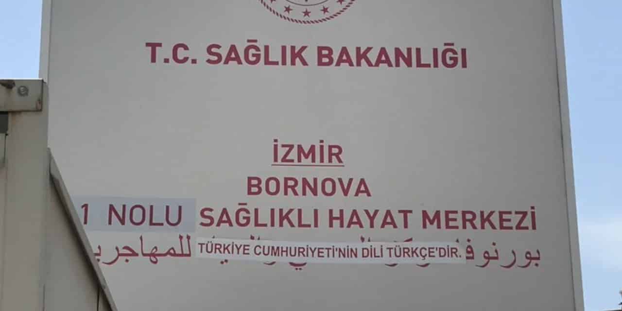 İzmir Bornova 1 No’lu Sağlıklı Hayat Merkezi’nin önüne gelen Memleket Partisi üyesi bir grup genç, yanlarında getirdikleri merdivenle tabelaya tırmanarak Arapça yazıların üzerini “Türkiye Cumhuriyeti’nin dili Türkçedir” yazılı yapıştırma ile kapattı.