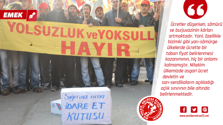 Esasında bir asgari ücretin belirlenmesi, işçi sınıfının bedeller ödeyerek sağladığı bir kazanımdır. Ücrette bir taban sınırının belirlenmesi sömürüyü bir nebze olsun azaltabilecek, patronların keyfiliğini sınırlayabilecek bir uygulamadır. Ancak burada belirleyici olan işçi sınıfının örgütlü gücüdür. Eğer sınıfın örgütlülüğü zayıf olursa, burjuvazi yine keyfiyette sınır tanımamakta artı-değer gaspını arttırmak adına asgari ücreti istediği biçimde tayin edebilmektedir. Yani ücretlerin belirlenmesinde sınıf mücadelesi önemli bir faktördür. Sınıf mücadelesinin gerilediği dönemlerde asgari ücret açlık sınırına yaklaşır. Sınıf mücadelesinin yükseldiği dönemlerde ise asgari ücret emeğin maliyetinin bile üzerine çıkabilir. Yani sınıf mücadelesinin yükseldiği dönemlerde burjuvazi ücretleri bir miktar yükselterek kârının bir kısmından “feragat” edebilir. Salt ücret için verilen mücadele politik mücadele olmaz. İktidarı hedefleyen mücadele sınıf mücadelesidir. Burjuvazi bu politik mücadeleyi kırmak adına ücretleri biraz yükseltmek gibi kimi ekonomik tavizler verebilmektedir. Bugün ise sınıf mücadelesinin oldukça geri olması, işçi sınıfının politik bir güç olmaktan uzaklaşması nedeniyle egemenler krizin faturasını rahatlıkla halkın sırtına yıkabilmektedir. Ücretler düşerken, sömürü ve burjuvazinin kârları artmaktadır. Yani, özellikle bizimki gibi yarı-sömürge ülkelerde ücrette bir taban fiyat belirlenmesi kazanımının, hiç bir anlamı kalmamıştır. Nitekim ülkemizde asgari ücret devletin ve sarı-sendikaların açıkladığı açlık sınırının bile altında belirlenmektedir. Dahası ülkemizde asgari ücret, bir taban sınırı olmaktan çok, son dönemde sıkça kullanılan tabiri ile “ortalama” bir ücrete dönüşmüştür. Bugün Türkiye’de çalışan işçilerin yarısına yakını (yaklaşık 10 milyon işçi) asgari ücretle çalışmaktadır. 2020 yılında belirlenen asgari ücretin (yaklaşık 2300 lira), devlet kurumu olan TUİK’in bile açıkladığı açlık sınırının altında olduğu düşünüldüğünde, yaklaşık 10 milyon işçiye ve ailesine devletin ve patronların alenen açlık dayattığını görebiliriz.