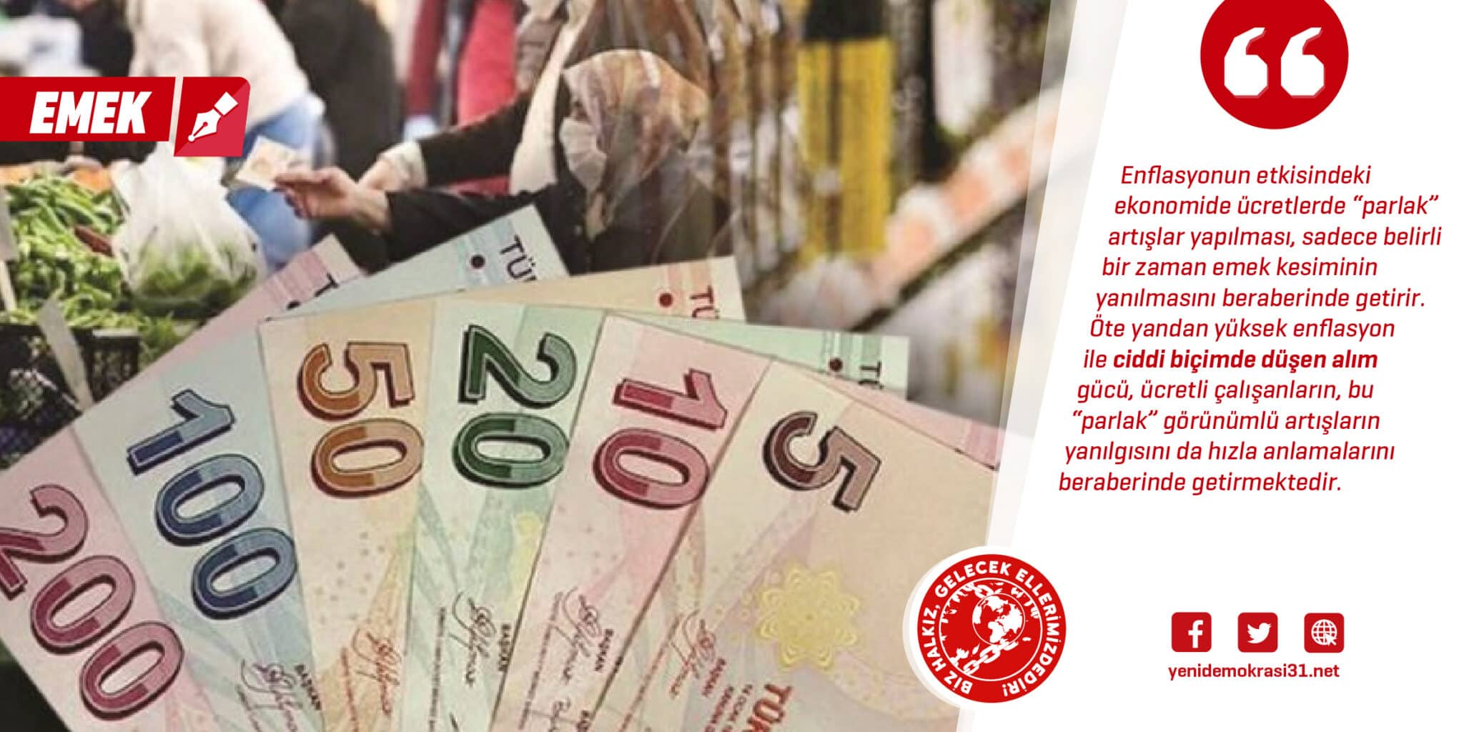 Enflasyonun etkisindeki ekonomide ücretlerde “parlak” artışlar yapılması, sadece belirli bir zaman emek kesiminin yanılmasını beraberinde getirir. Öte yandan yüksek enflasyon ile ciddi biçimde düşen alım gücü, ücretli çalışanların, bu “parlak” görünümlü artışların yanılgısını da hızla anlamalarını beraberinde getirmektedir. 2022 yılının temmuz ayında asgari ücreti heyecanla bekleyen geniş bir kesimin bugün ocakta yapılacak zammı aynı hevesle beklemiyor olduğu açıktır.