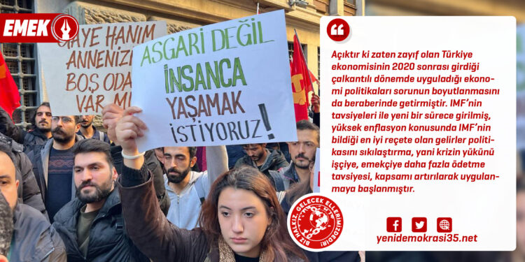 Açıktır ki zaten zayıf olan Türkiye ekonomisinin 2020 sonrası girdiği çalkantılı dönemde uyguladığı ekonomi politikaları sorunun boyutlanmasını da beraberinde getirmiştir. IMF’nin tavsiyeleri ile yeni bir sürece girilmiş, yüksek enflasyon konusunda IMF’nin bildiği en iyi reçete olan gelirler politikasını sıkılaştırma, yani krizin yükünü işçiye, emekçiye daha fazla ödetme tavsiyesi, kapsamı artırılarak uygulanmaya başlanmıştır. Ekim ayında IMF Avrupa Direktörü tarafından Türkiye için üst perdeden söylenen “asgari ücret yılda bir kez artırılmalı, gerçekleşen değil hedeflenen enflasyon baz alınmalı” söylemi, bu yılki asgari ücretin belirlenmesinde IMF’nin etkisinin daha net görülmesini sağlamıştır.