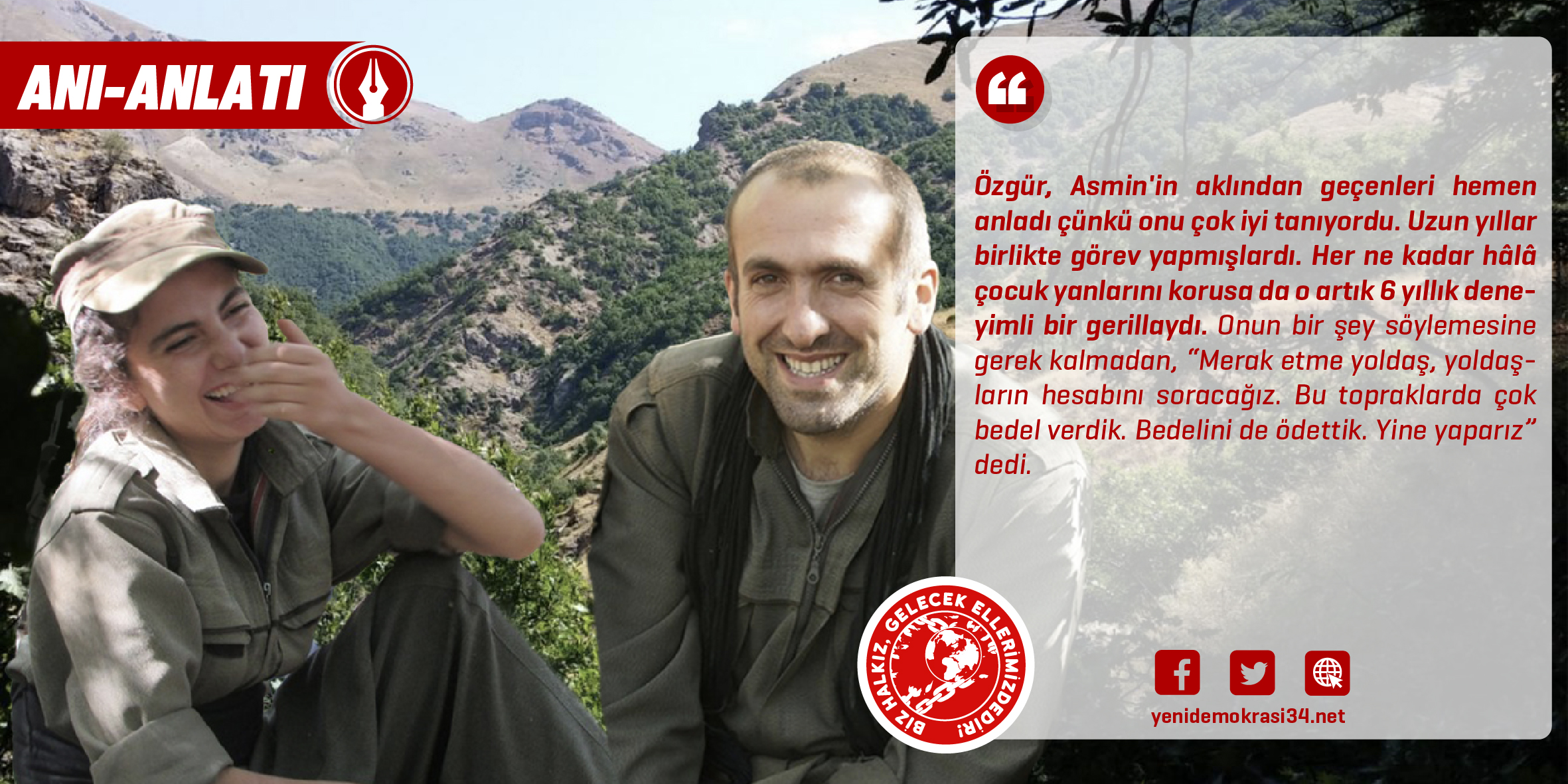 Özgür, Asmin’in aklından geçenleri hemen anladı çünkü onu çok iyi tanıyordu. Uzun yıllar birlikte görev yapmışlardı. Her ne kadar hâlâ çocuk yanlarını korusa da o artık 6 yıllık deneyimli bir gerillaydı. Onun bir şey söylemesine gerek kalmadan, “Merak etme yoldaş, yoldaşların hesabını soracağız. Bu topraklarda çok bedel verdik. Bedelini de ödettik. Yine yaparız” dedi. Bölgede ve noktada yaptıkları gözlemler ve görüşmeler üzerinden düşmanın ve yoldaşların hareket tarzını anlamaya, verilen açıkları çözümlemeye çalıştılar.
