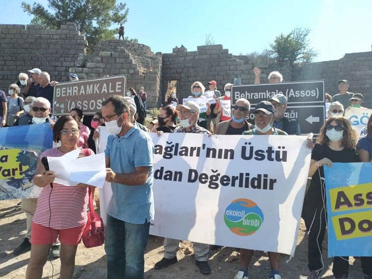 HABER MERKEZİ- Kazdağı Doğal ve Kültürel Varlıkları Koruma Derneği, Assos Dostları, Kazdağları Ekoloji Platformu’nun çağrısıyla Assos Antik Kenti-Behramkale Köyü girişinde, ‘Assos’ta Katliamı Durduralım, Assos’uma Dokunma!’ demek için bir basın açıklaması gerçekleştirildi: “Yapılan geniş teraslamaların amacının, güvenlik tedbirinden çok, otopark ve yeni ticari alan yaratmak olduğu anlaşılıyor. Bu durumdan kimlerin yarar sağlayacağını çok merak ediyoruz. “