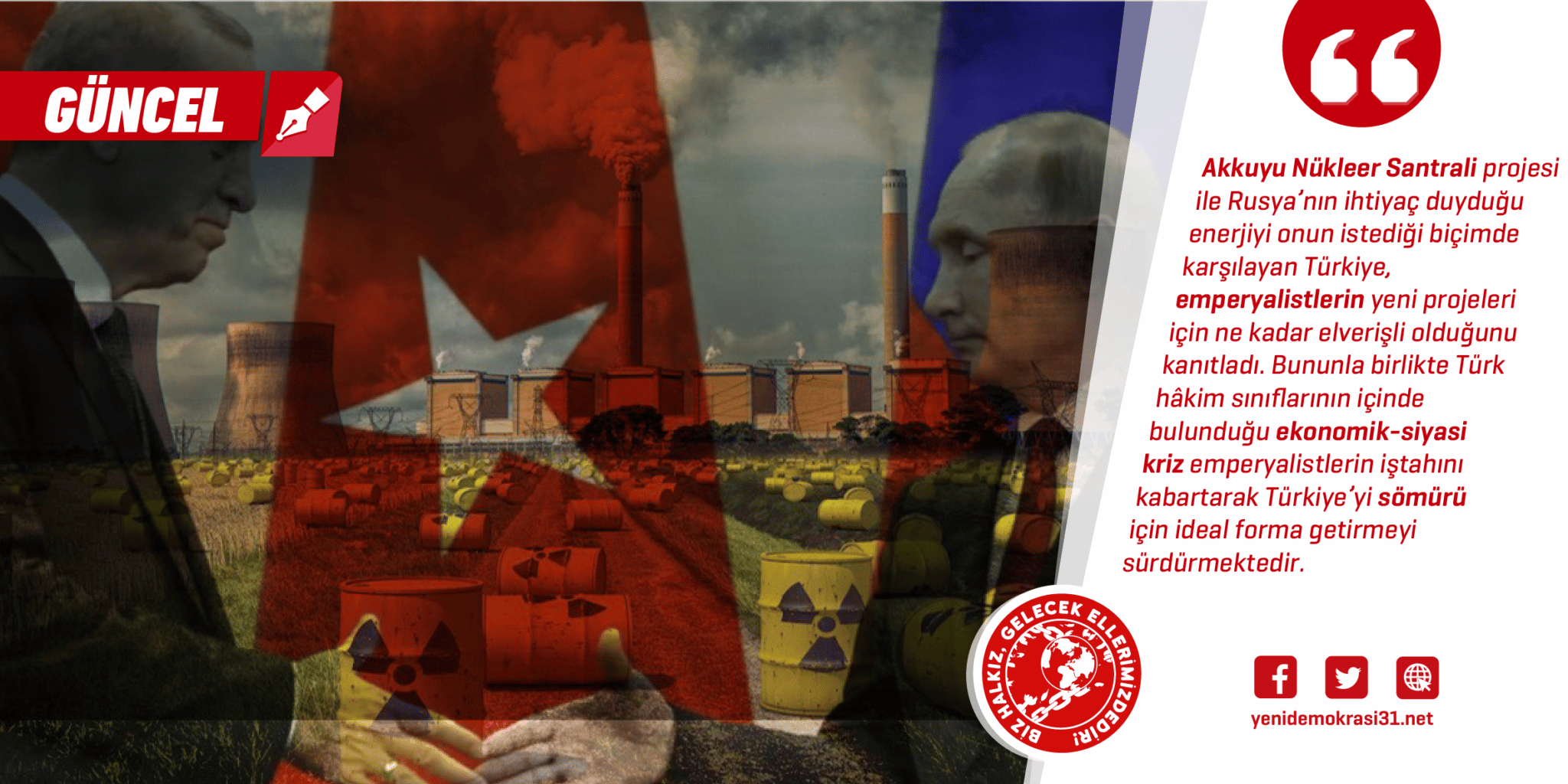 Bu durum Türkiye için emperyalist kliklerin pervasızca belirlediği ve boyunduruk altına aldığı politikalara uyma zorunluluğunu da doğurmaktadır. Yeni Demokrasi Gazetesi’nin 118. sayısının “Akkuyu Nükleer Santrali: Rus Emperyalizminin Enerji Sömürüsü” başlıklı yazısında Rusya’nın Akkuyu Nükleer Santrali üzerinden gerçekleştirdiği sömürü politikalarına değinilmişti. Bu politikaların emperyalizmi doyuran özelliği Rus emperyalizminin sömürü alanını genişletme isteğini ve Türkiye’yi en güvenilir gaz merkezi haline getirme durumunu pekiştirmiştir.