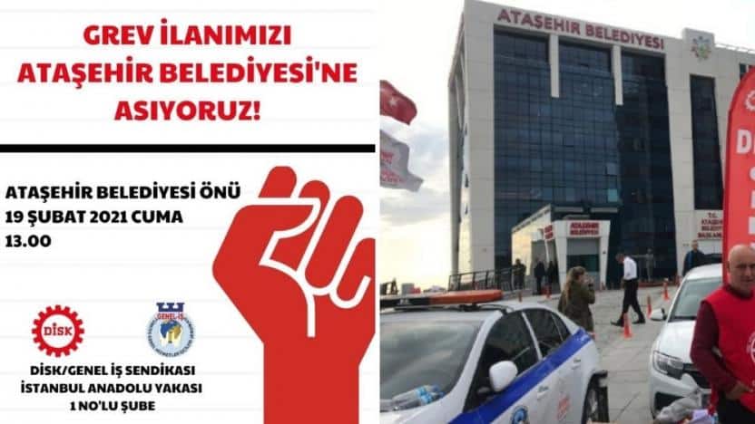 DİSK’e bağlı Genel-İş Sendikası İstanbul Anadolu Yakası 1 No’lu Şube, grev ilanının yarın saat 13.00’te Ataşehir Belediyesi önünde yapılacak kitlesel basın açıklamasıyla işyerine asılacağını, grev tarihinin açıklanacağını duyurdu.