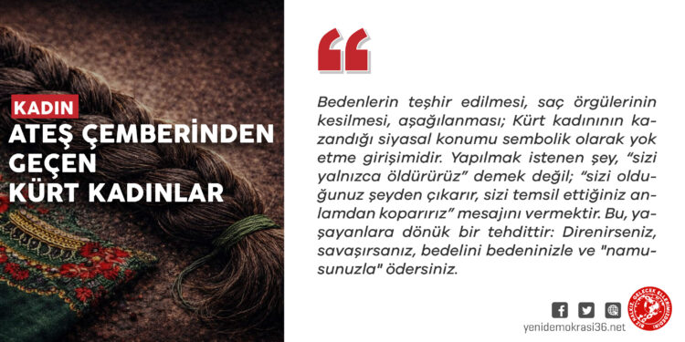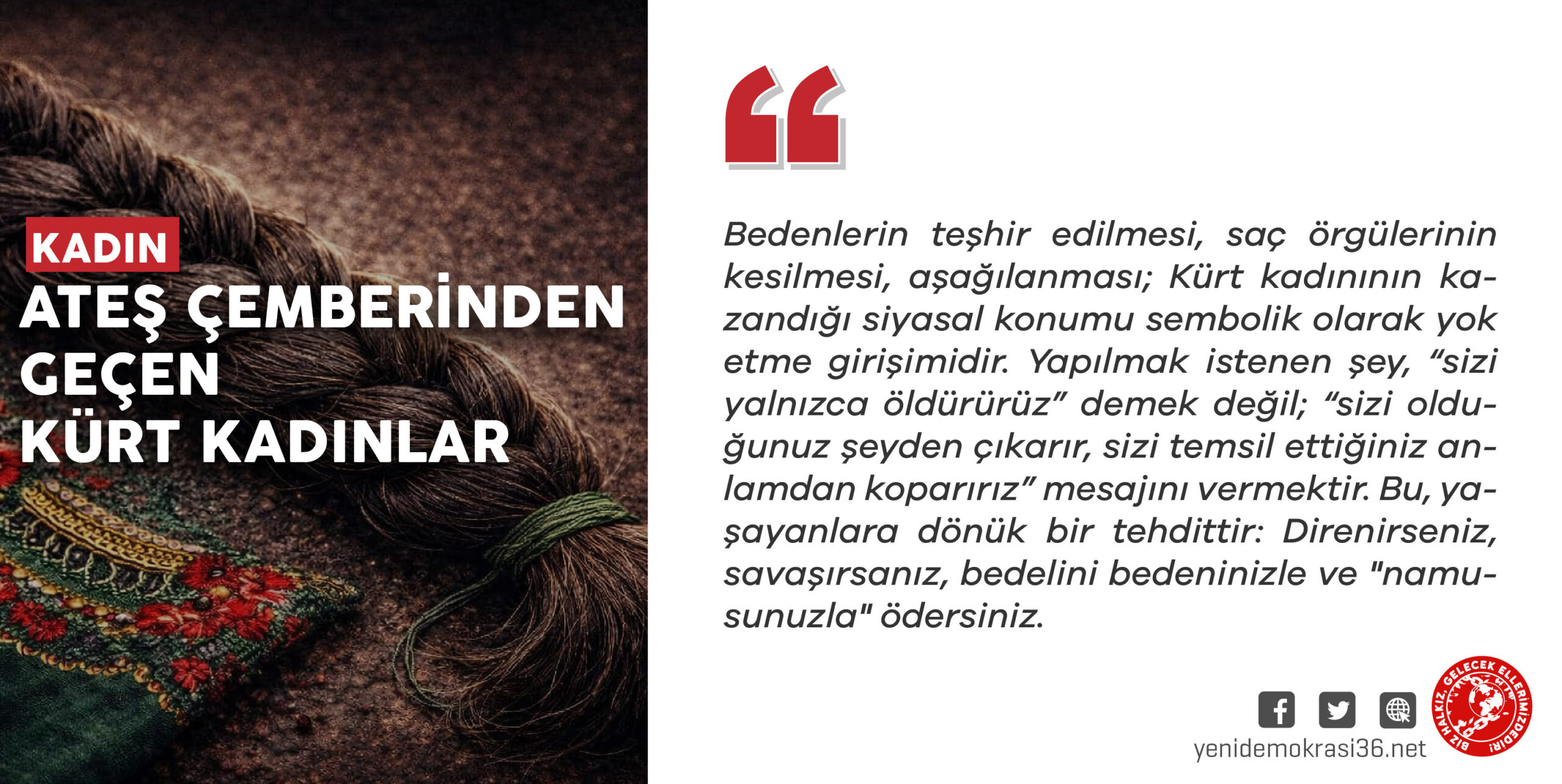 Beden teşhirinin, parçalanmasının ve aşağılanmasının, erkek egemen iktidarın en eski disiplin araçlarından biri olduğunu biliyoruz. Çünkü beden, kadının hem en görünür hem de en çok denetlenen, hiçbir zaman kendisine ait olmayan “alanıdır.” Erkek egemen sistem, kadını tarih boyunca ya örtülmesi ya da teşhir edilmesi gereken bir varlık olarak tanımlamış; her iki durumda da onun bedeni üzerinden iktidar kurmuştur. Kürt kadınlara yönelen bu şiddet biçimi de tam olarak bu tarihsel hattın güncel bir devamıdır.