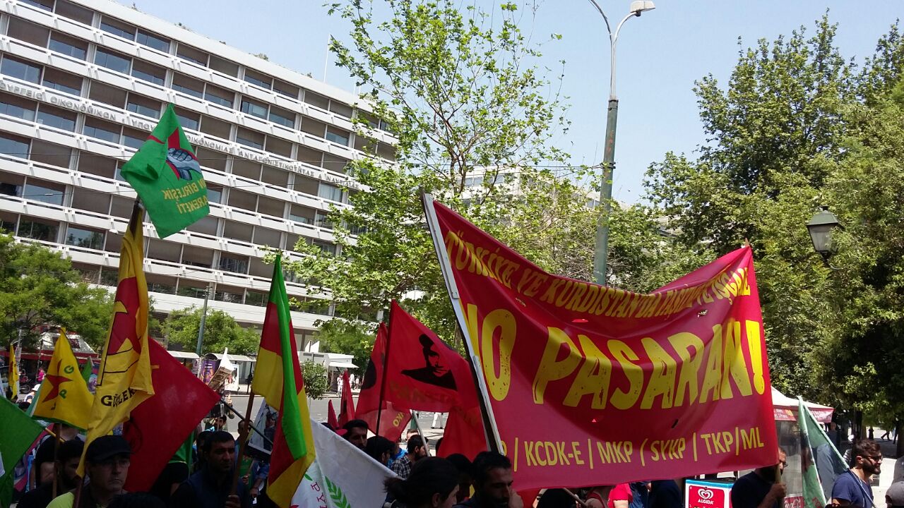 Türkiyeli ve T.Kürdistanlı devrimciler ise “NO PASARAN” imzalı ortak pankartla bir kortej oluşturdu. TKP/ML, KCDK-E, DKP, SYKP ve MKP imzalı pankart Yunanlılar tarafından ilgiyle karşılandı. Kortej yürüyüşü boyunca Faşist Türk devletini teşhir eden sloganlar yanında, Faşizmin Rojava ve Efrin’e yönelik işgal ve saldırı politikası protesto edildi. Ayrıca uluslararası dayanışmayı içeren sloganlarda yürüyüş boyunca atıldı. Partizan ve TKP/ML flamaları bu kortejde de yerini aldı.
