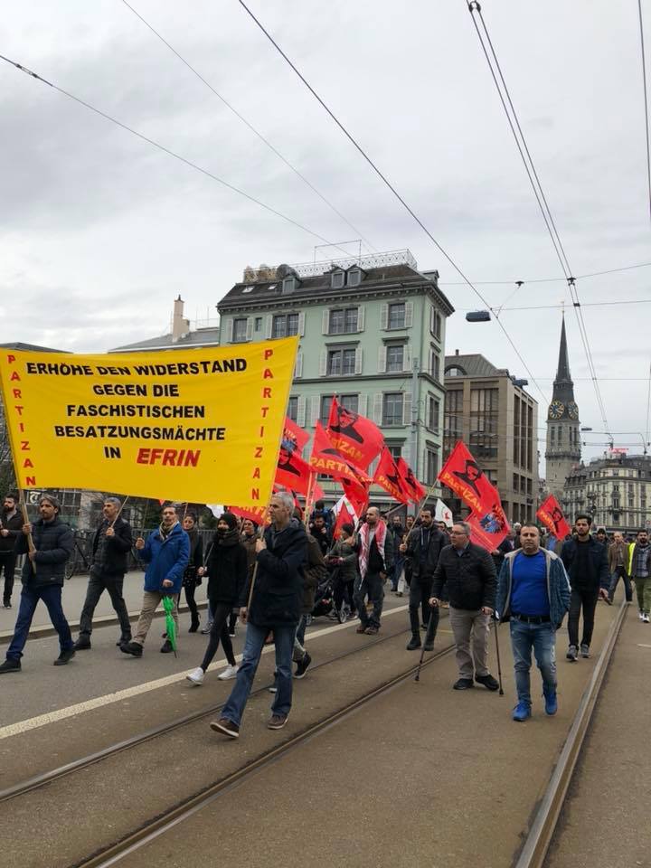 Zürih kentinde saat 21.00’de acil bir araya gelen Afrin-Rojava Dayanışma Platformu bileşenleri, burada bir açıklama yaptıktan sonra önce Rus Konsolosluğu’nun önüne yürüyerek burada emperyalist Rusya’yı protesto etti. Buradan sloganlar ve zılgıtlarla Türk Konsolosluğu’nun önüne yürüyen kitle, burada yaklaşık bir saat bekleyerek protesto eylemi gerçekleştirdi. Buradan Zürih Tren Garı’na yürüyen kitle burada da bir protesto eylemi gerçekleştirdi.