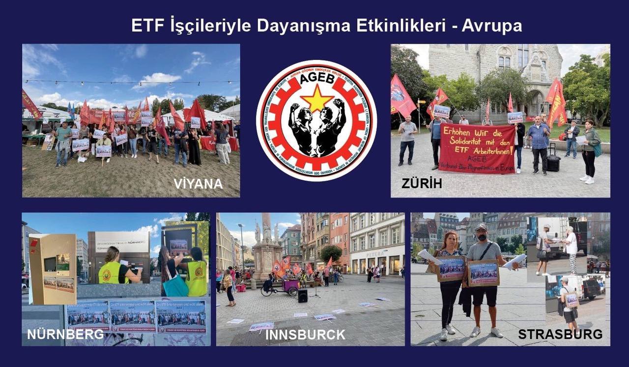 ETF işçileriyle dayanışma amaçlı olarak Nürnberg AGEB faaliyetçileri tarafından kentin çeşitli noktalarında afişleme ve bildiri dağıtımı gerçekleştirildi. Ayrıca Almanya’nın önemli sendikalarından DGB ve Ver.di binalarına afişler asıldı, bildiriler bırakılarak duyarlılık çağrısı yapıldı.