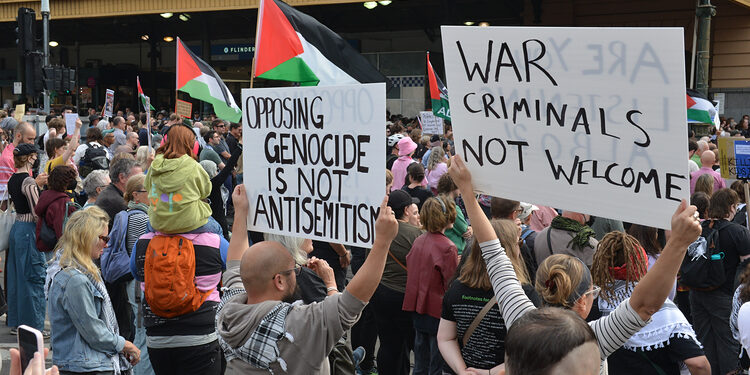 Sydney Belediye Binası önünde toplanan binlerce kişi, Herzog’un ziyaretine tepki göstermek amacıyla yürüyüş düzenledi. Kitle, Filistin bayrakları açarak, Siyonist İsrail’in Gazze’ye yönelik saldırılarını protesto etti.