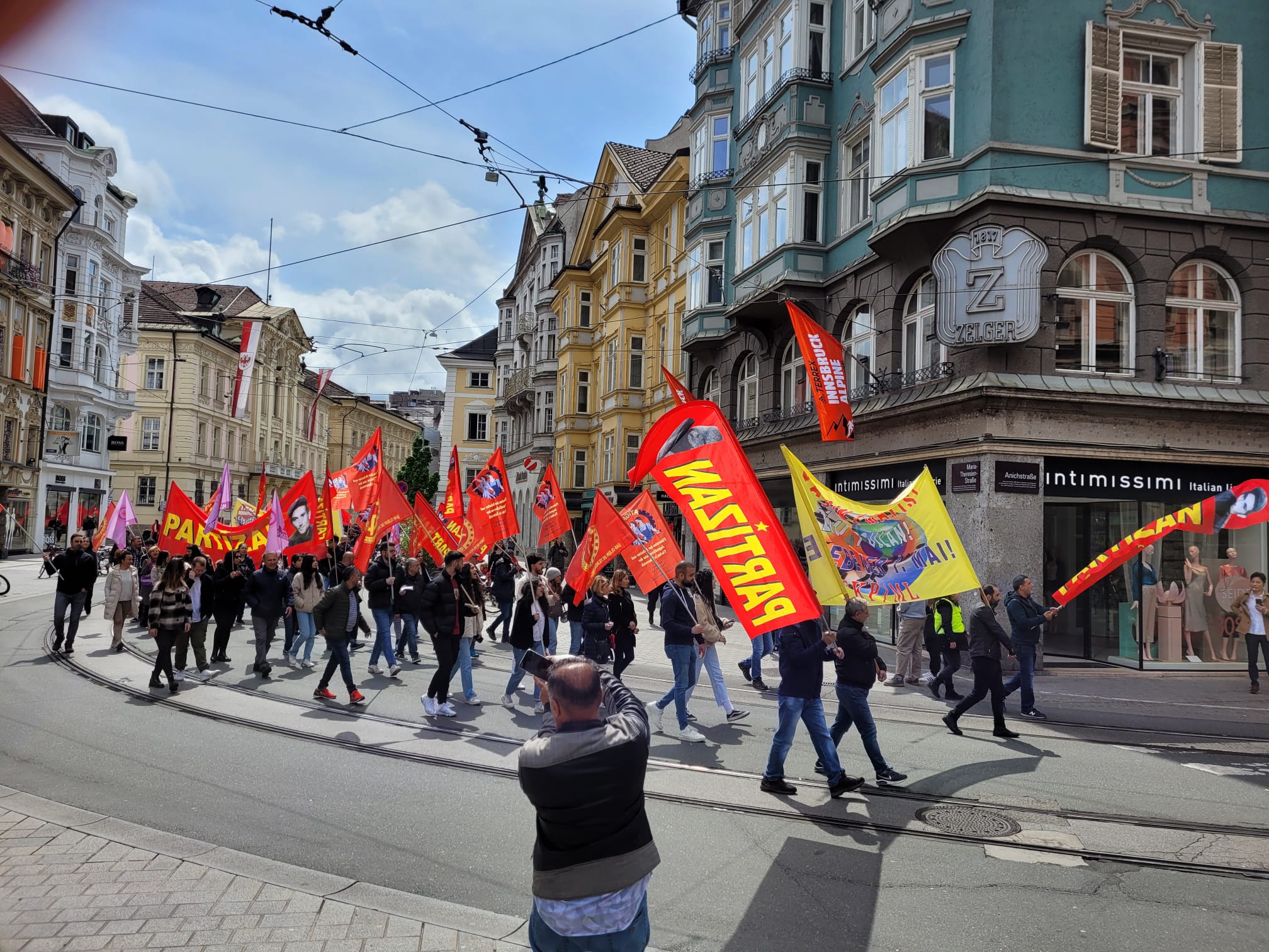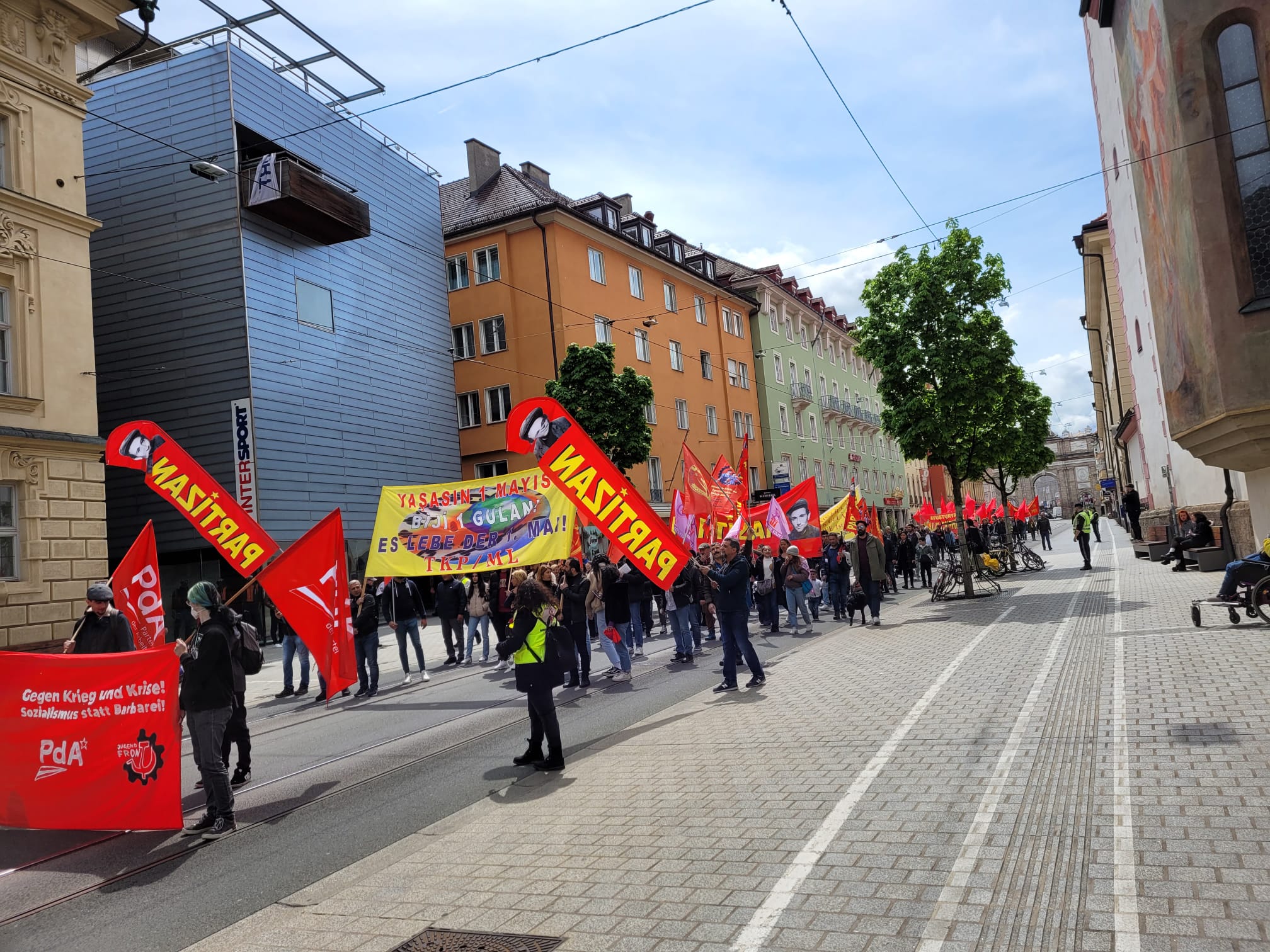 Innsbruck Landhausplatz’da başlayan yürüyüş, Landestheather’e kadar sürdü. Yol boyunca sloganların susmadığı ve marşların ses cihazıyla seslendirildiği eylemde, Proletarya Partisinin 50. Kuruluş yılı selamlandı.