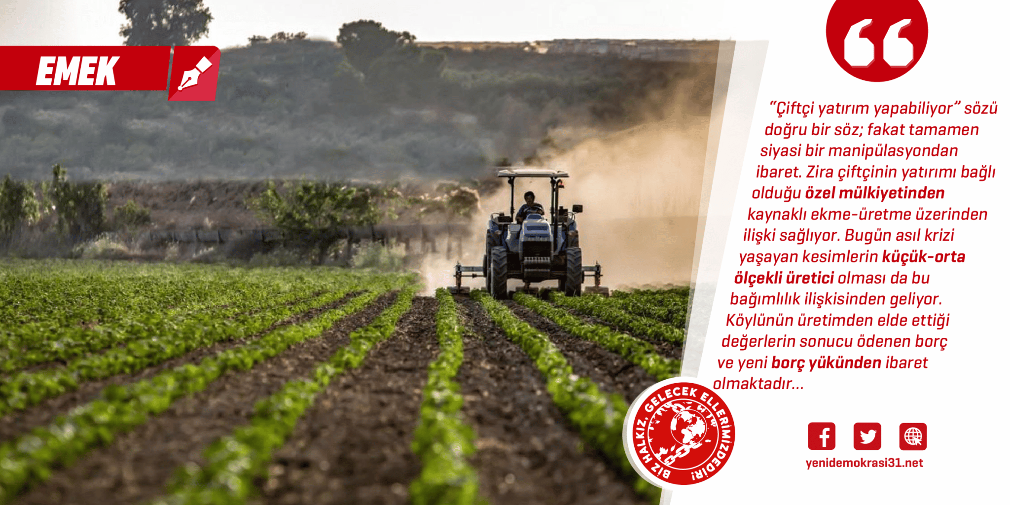 Köylünün tarımda makineleşme olanağı ancak ve ancak borç yükü altına girerek satın alabileceği makinelere bağlıdır. Hal böyleyken köylünün üretimi yıllara varan borç yükünü ödemekle geçmektedir. Tapu ve Kadastro Genel Müdürlüğünden alınan TAKBİS verilerine göre 2022 Ocak ayında Türkiye’deki yaklaşık 24 milyon hektarlık tarım arazisinden 4 milyon hektarı son beş yıl içerisinde bankalara ipotek edilmiştir. Yaklaşık yüzde 16,6’sı ipotek edilen arazilerde arazi kaybının yaşanmaması için yapılacak tek şey “üretimden yüzde 100’ün üzerinde” kâr etmektir!