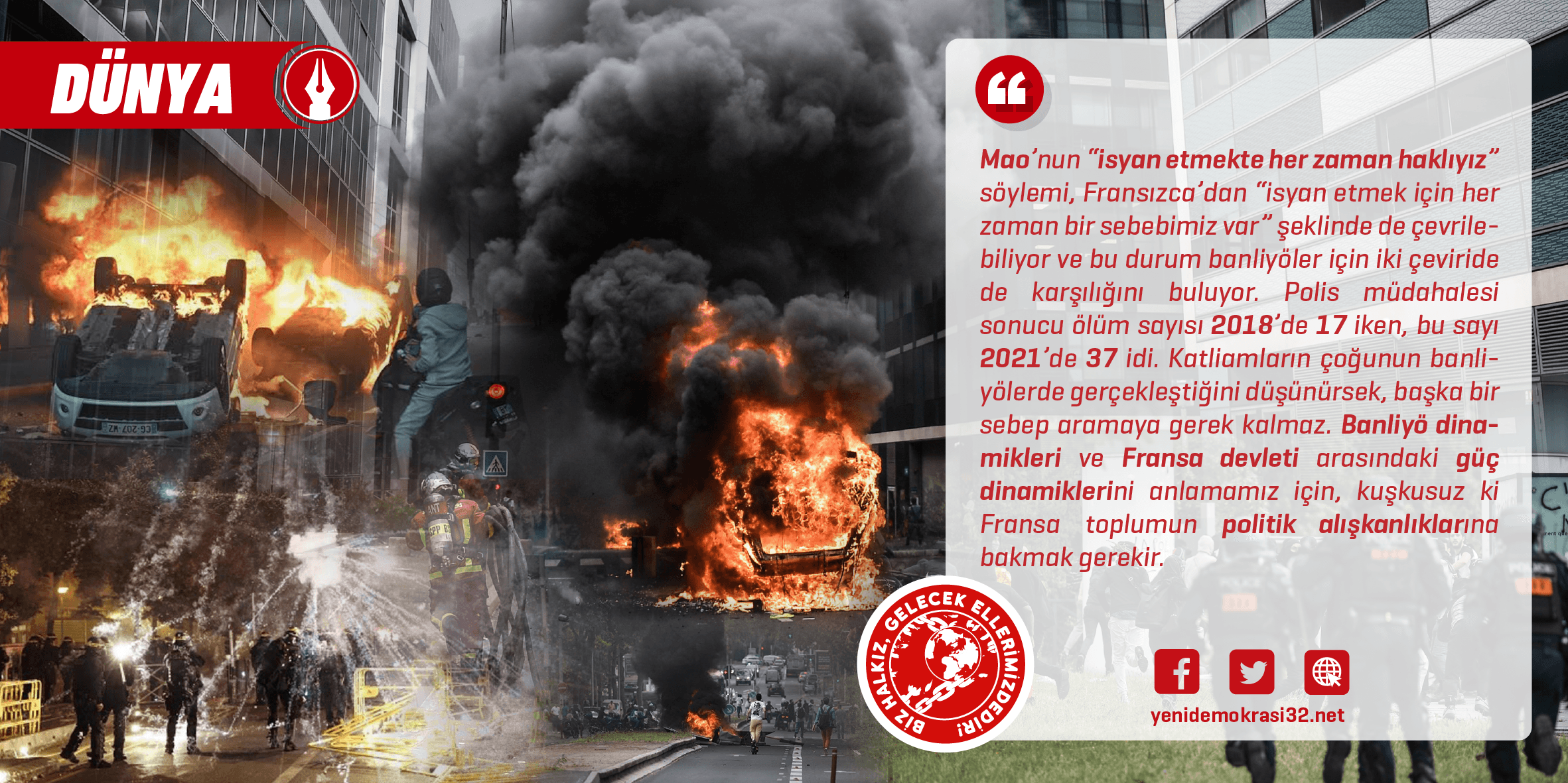 Mao’nun “isyan etmekte her zaman haklıyız” söylemi, Fransızca’dan “isyan etmek için her zaman bir sebebimiz var” şeklinde de çevrilebiliyor ve bu durum banliyöler için iki çeviride de karşılığını buluyor. Polis müdahalesi sonucu ölüm sayısı 2018’de 17 iken, bu sayı 2021’de 37 idi. Katliamların çoğunun banliyölerde gerçekleştiğini düşünürsek, başka bir sebep aramaya gerek kalmaz. Banliyö dinamikleri ve Fransa devleti arasındaki güç dinamiklerini anlamamız için, kuşkusuz ki Fransa toplumun politik alışkanlıklarına bakmak gerekir.