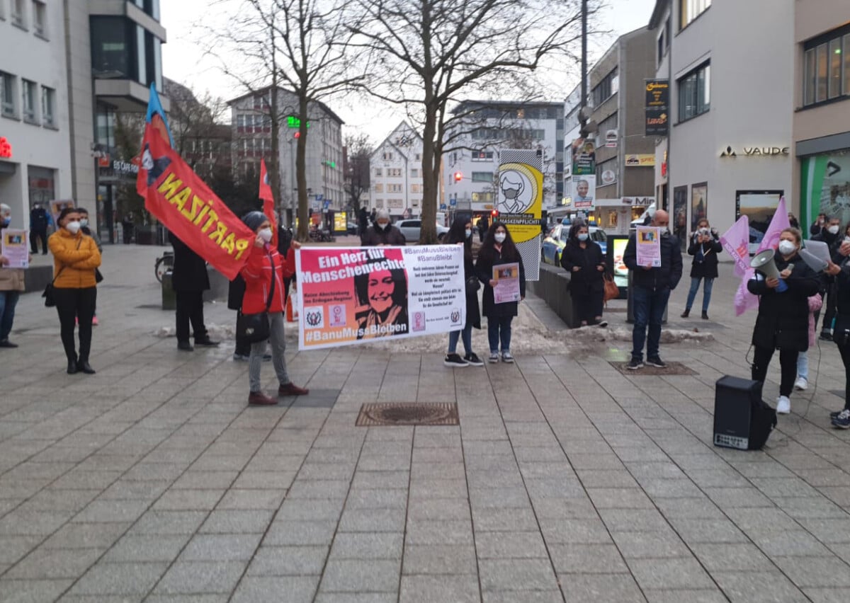 AGİF, SKB, ADHF, ADKH, ATİF, Yeni Kadın, Halk Cephesi, DİDF, Die Linke, AKM, AKM Ulm Kadın, Trotz Alledem, Avrupa Demokrat Gazetesi gibi devrimci-demokrat çevreden kişi ve kurumların destek verdiği eylemde, “Banu yalnız değildir!” yazılı pankart açıldı, dövizler taşındı.