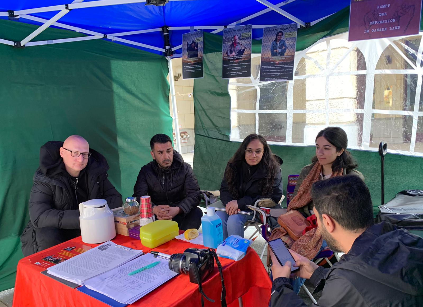 Almanya’nın başkenti Berlin’de İçişleri Bakanlığı önünde, faşist 129 a/b yasalarının iptali ve İhsan Cibelik, Özgül Emre, Serkan Küpeli ve Hasan Unutan’ın serbest bırakılması amacıyla 42 gündür süren açlık grevine destek amaçlı katılan Eda Deniz Haydaroğlu da açlık grevinin 40. gününe girmiş bulunmakta.